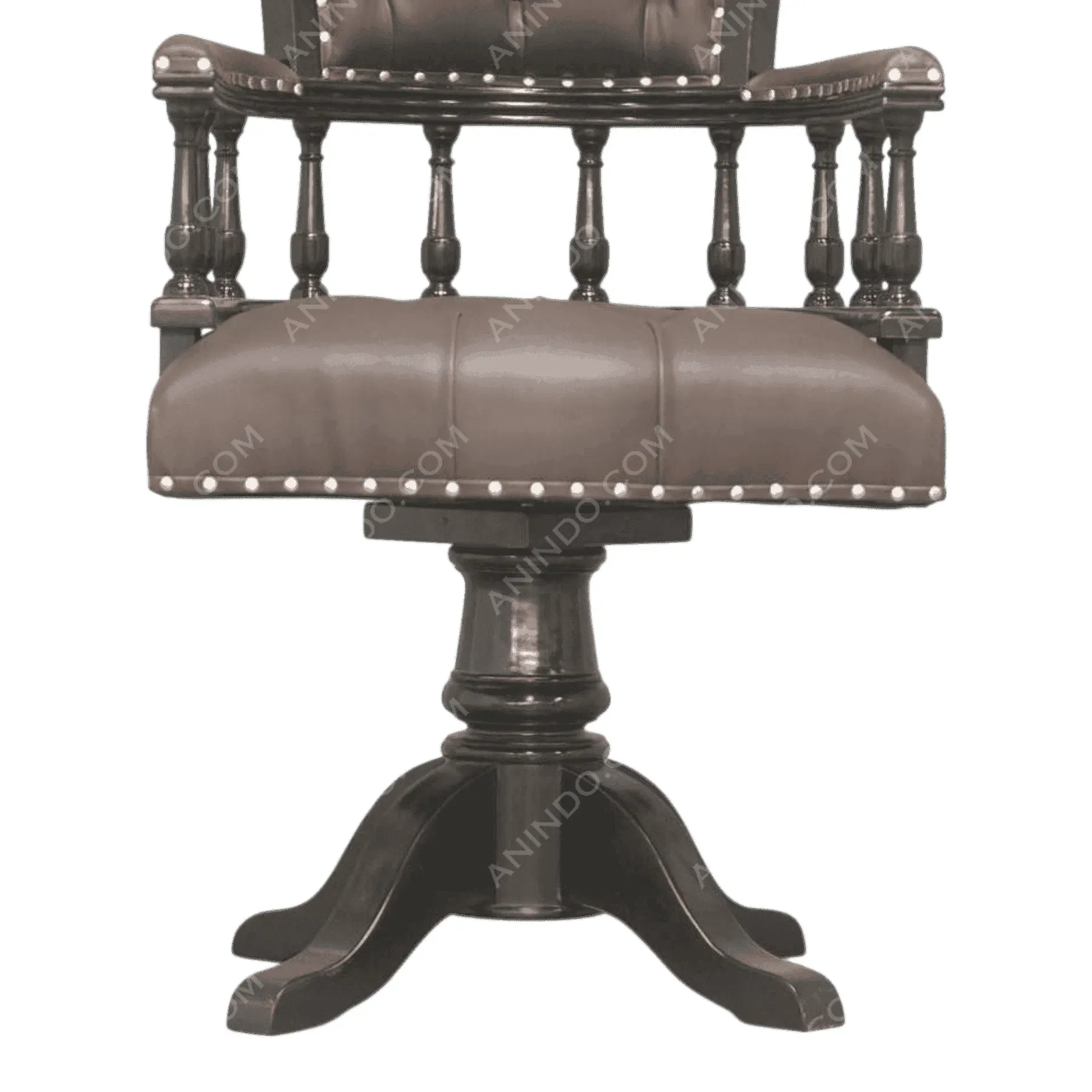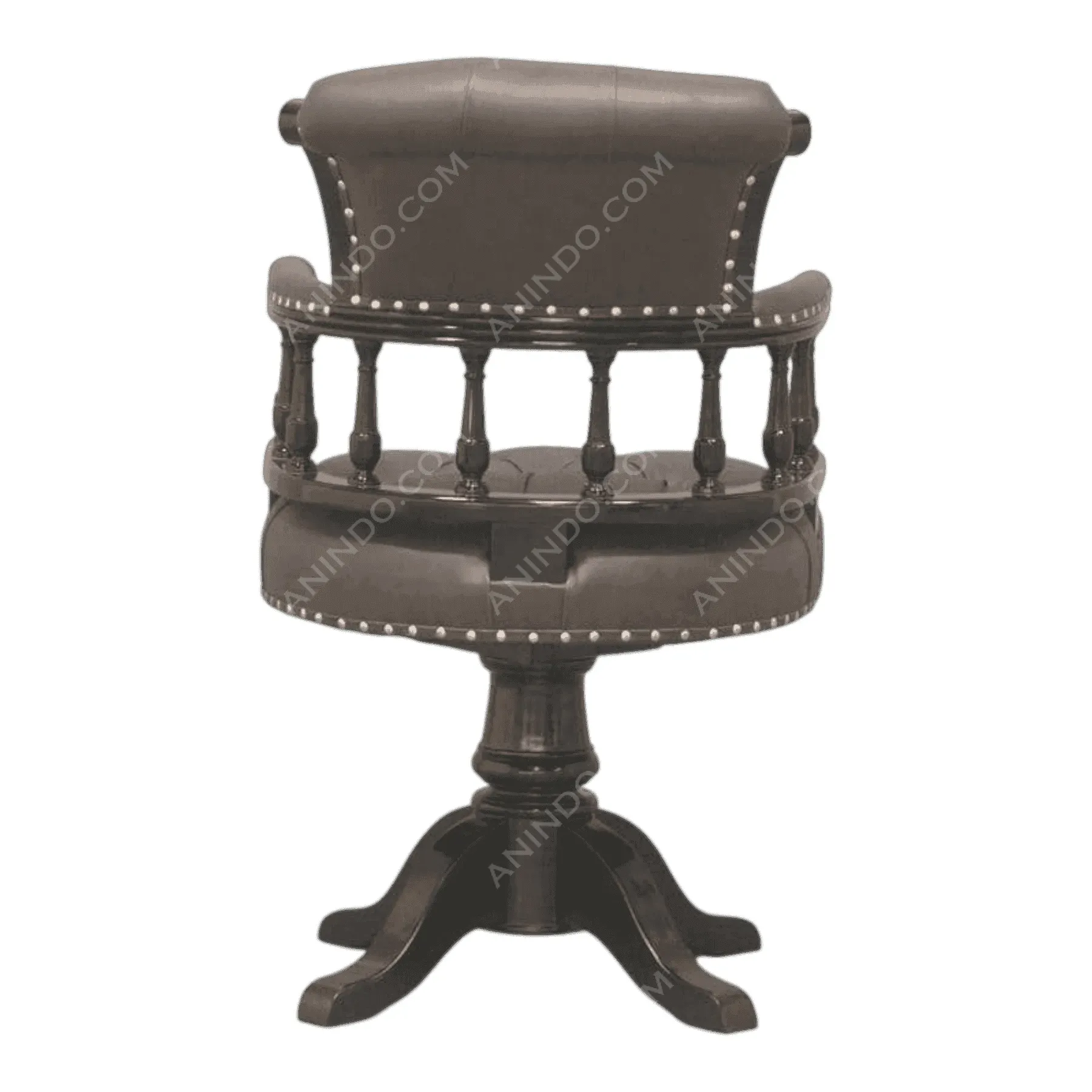 Captain’s Barrel Swivel Chair is a dignified blend of traditional nautical design and executive comfort Crafted in a rich dark chocolate tone the chair features deep button-tufting and a robust barrel back providing comprehensive lumbar support Classic spindle detailing adorns the arms adding a touch of vintage elegance Supported by a substantial wooden five-star base it offers a firm stable swivel and tilt mechanism The use of nailhead trim along the edges completes the distinguished look making this chair an imposing yet comfortable fixture for a serious study or a classic home office