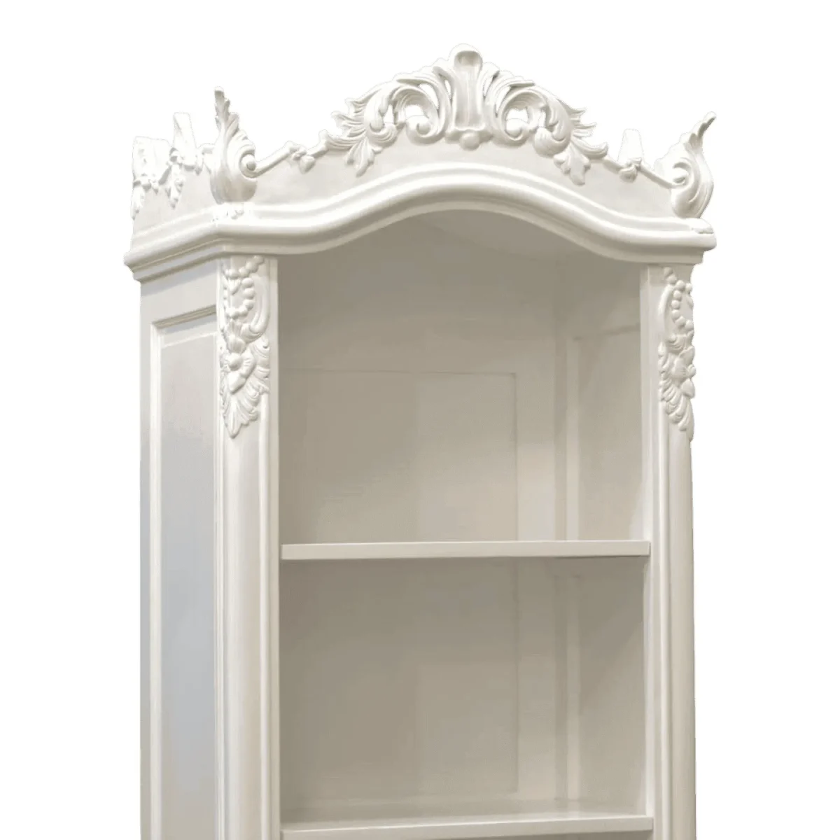 Display your treasured collectibles in this ethereal white cabinet that embodies the lightness of the Rococo style The piece features a dramatic arched top crowned with an elaborate floral carving and stands on elegant cabriole legs The open shelving format invites light and airiness making it perfect for displaying porcelain books or linens without weighing down the visual space of the room The pristine white finish ensures it blends seamlessly into bright airy interiors