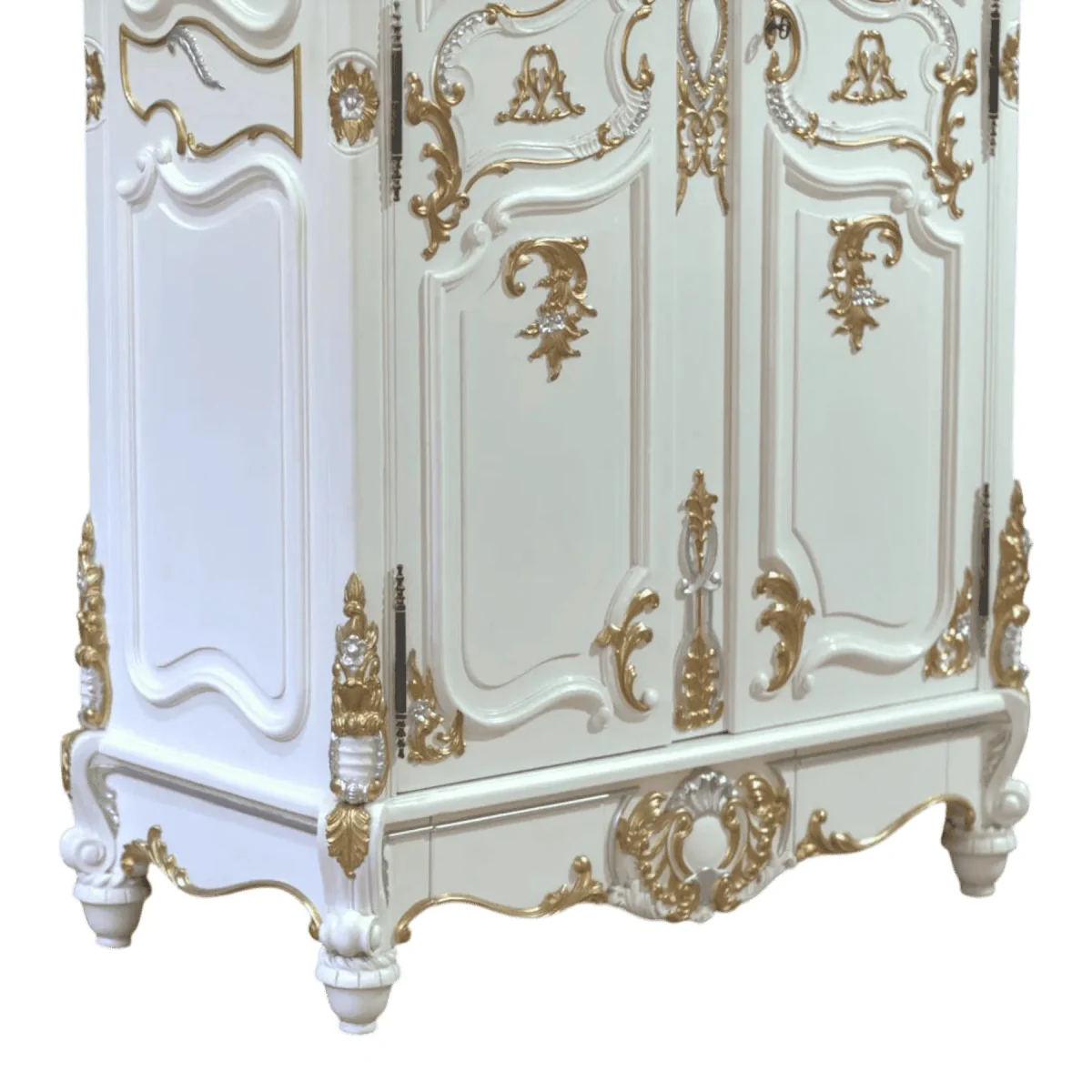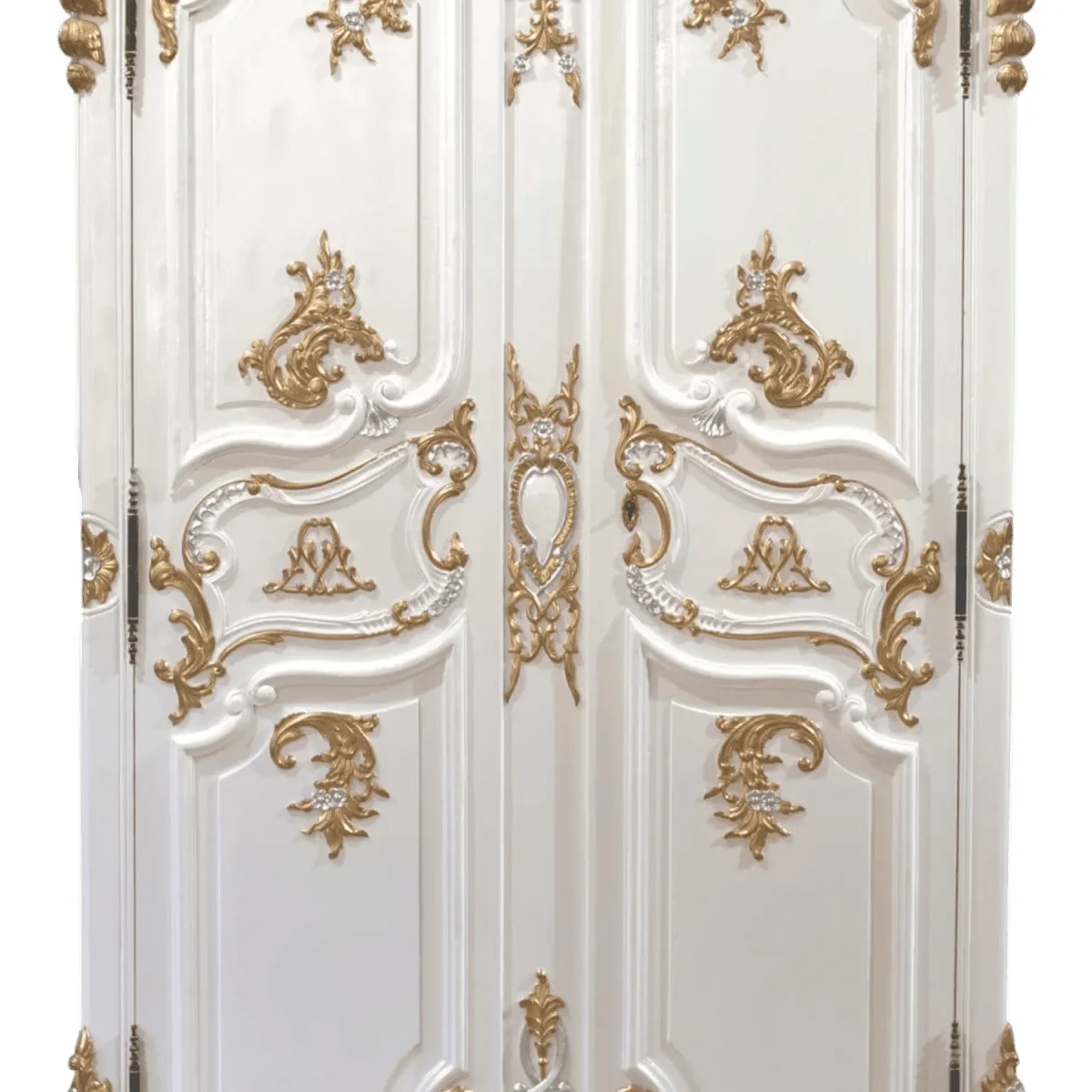 This breathtaking armoire is a masterclass in French Baroque design featuring an explosion of hand-carved shells acanthus leaves and floral crests all finished in a regal white and gold palette The tall arched doors open to reveal a cavernous interior that can be customized for hanging space or shelving making it a versatile addition to a bedroom or as a statement linen press in a grand hallway The mirrored accents and deep carvings create a three-dimensional masterpiece that changes as you walk past it catching the light from every angle Imagine your wardrobe housed in a piece that feels like a portal to another era where craftsmanship was the ultimate expression of status This wardrobe is not just furniture it is a monumental work of art that elevates the entire architecture of a room providing a lifestyle of unmatched luxury and historical appreciation