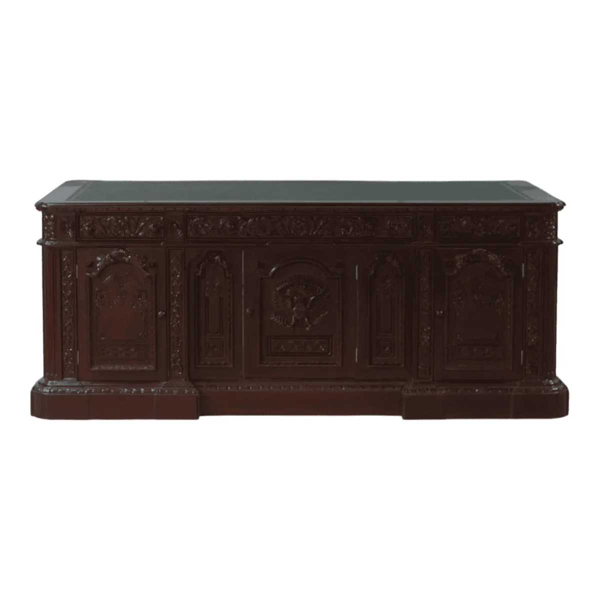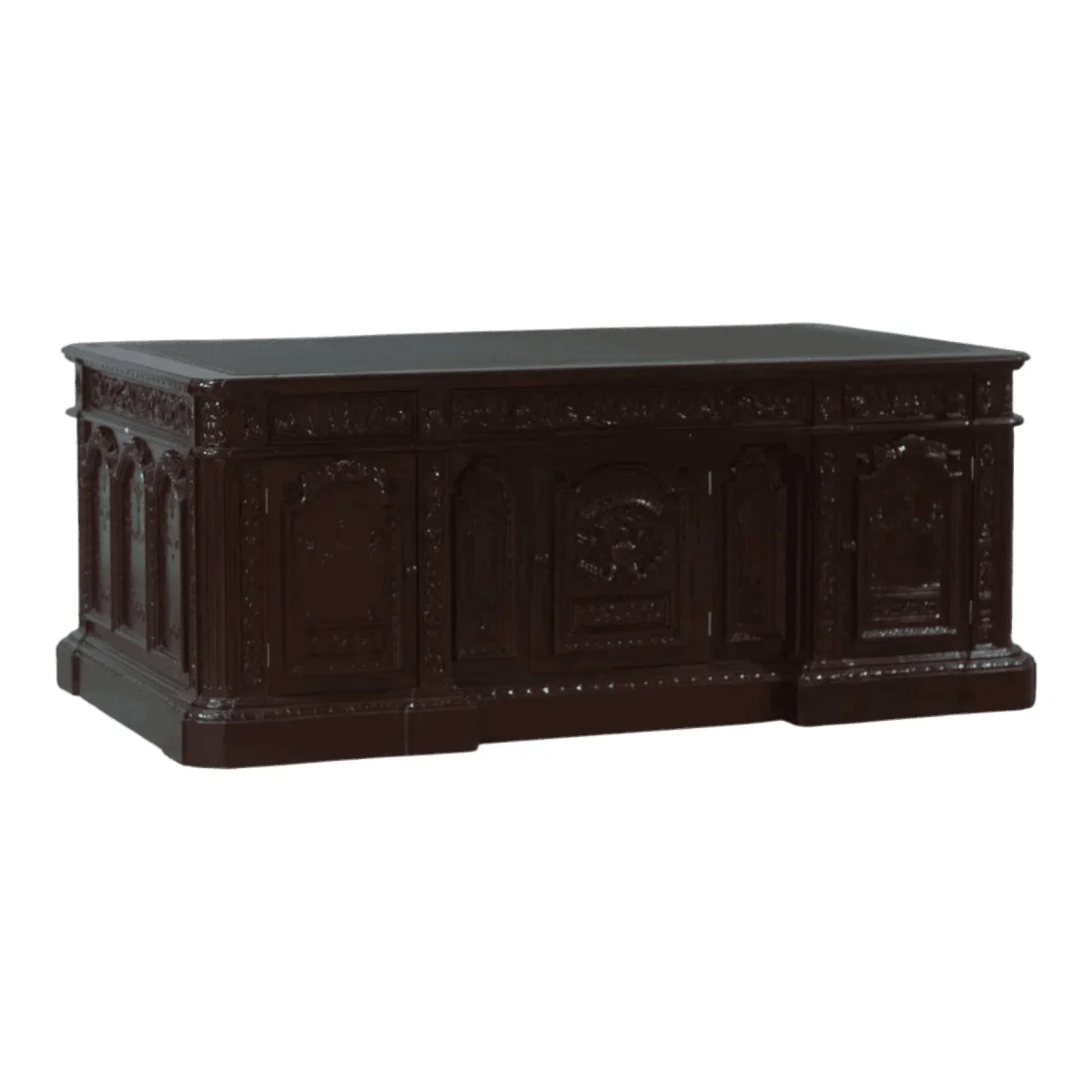 Own a piece of history with this monumental executive desk modeled after the world’s most famous presidential workstations featuring dense hand-carved panels and a deep mahogany finish The front face of the desk is dominated by a grand seal surrounded by intricate scrollwork that signifies power and responsibility Each side of the desk is a gallery of craftsmanship with arched panels and decorative pilasters that create a sense of architectural permanence The dark lustrous finish highlights the depth of the wood grain providing a tactile richness that commands respect in any professional setting This is a desk for the decision-maker the historian and the leader who understands that a workspace should be as significant as the work performed within it With ample hidden storage and a sprawling work surface it provides the perfect balance of functional utility and undeniable prestige ensuring that your office remains the center of gravity in your home or business