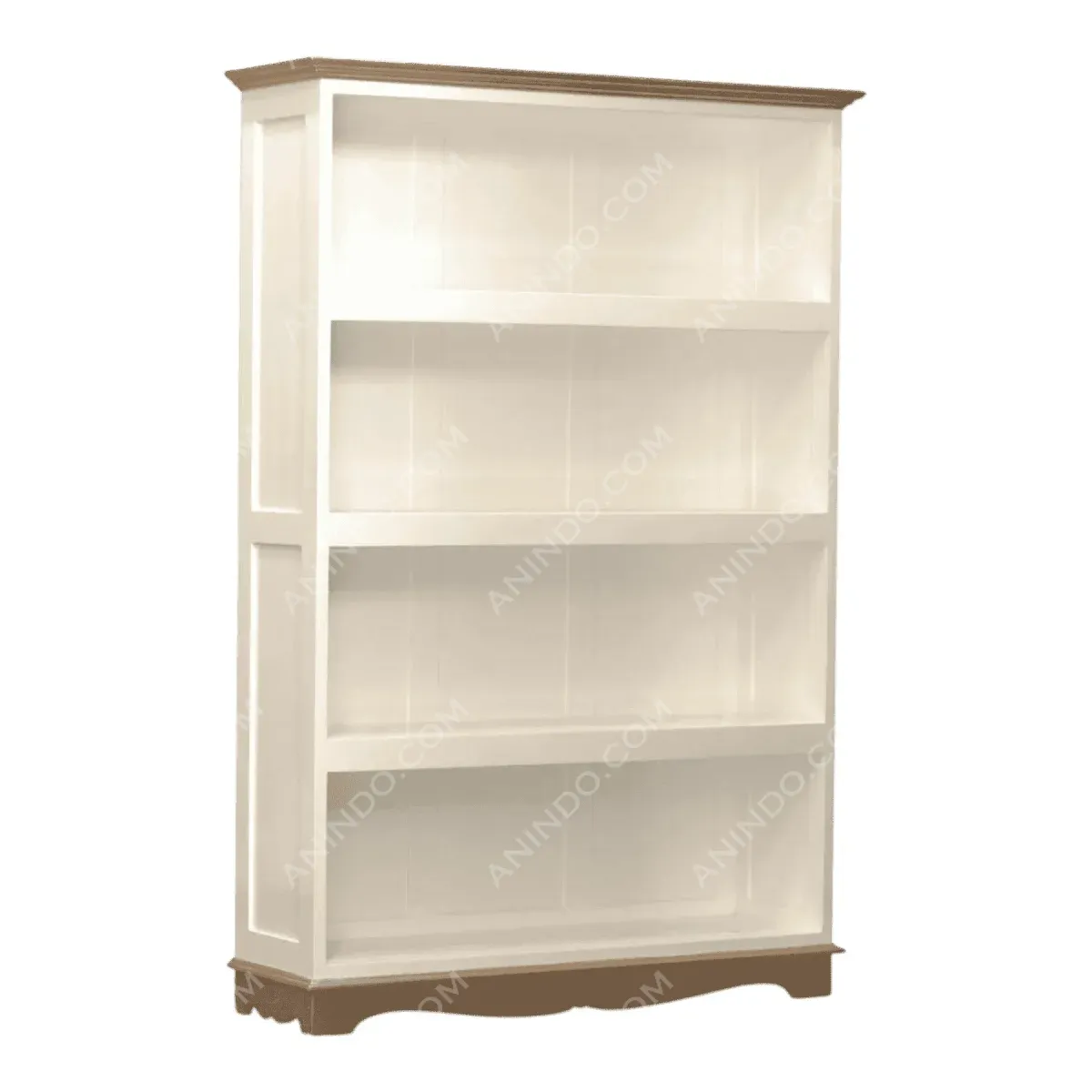 Brighten your library or coastal living space with this tall open bookcase finished in a refreshing white with elegant silver accents The beadboard backing adds a touch of cottage charm while the metallic trim on the cornice and shelves elevates the look to something more sophisticated Four spacious shelves provide ample room for books and decor resting above a shapely apron that adds a hint of French curvature