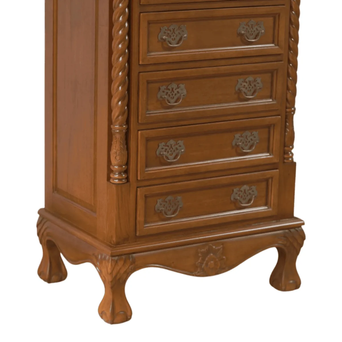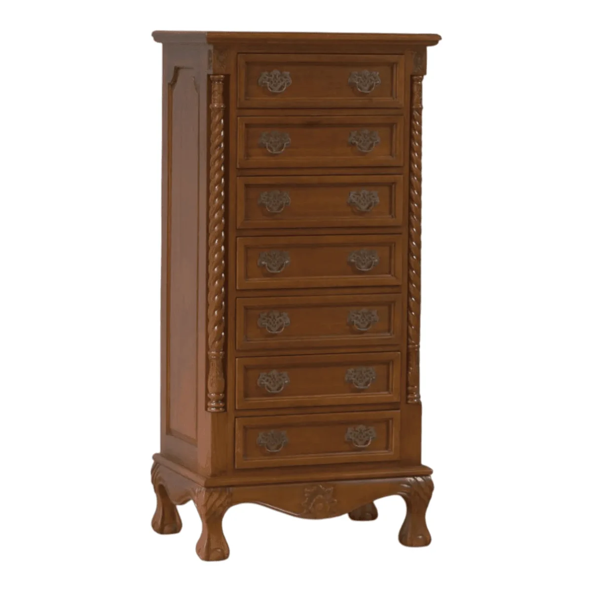 Transform your dressing area with this vertical masterpiece of cabinetry that blends timeless sophistication with modern utility providing a slender silhouette perfect for maximizing vertical space in smaller rooms or grand suites alike while the rich wood tones evoke a sense of warmth and history in every grain pattern visible on the drawer fronts which glide smoothly to reveal ample storage for your most precious textiles and accessories ensuring your sanctuary remains organized and elegant at all times as the cabriole legs provide a graceful lift that makes the piece feel light yet grounded in traditional craftsmanship that will endure for decades to come as a focal point of your interior design journey where luxury meets daily function in a seamless dance of mahogany beauty and artisanal pride that captures the very essence of high-end Indonesian furniture making