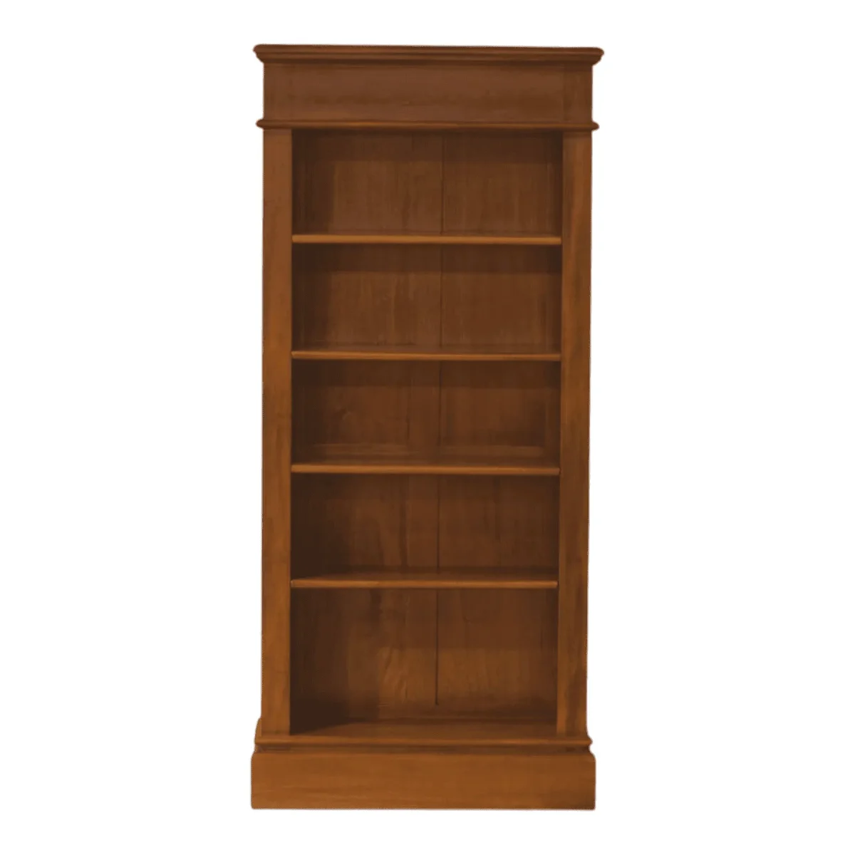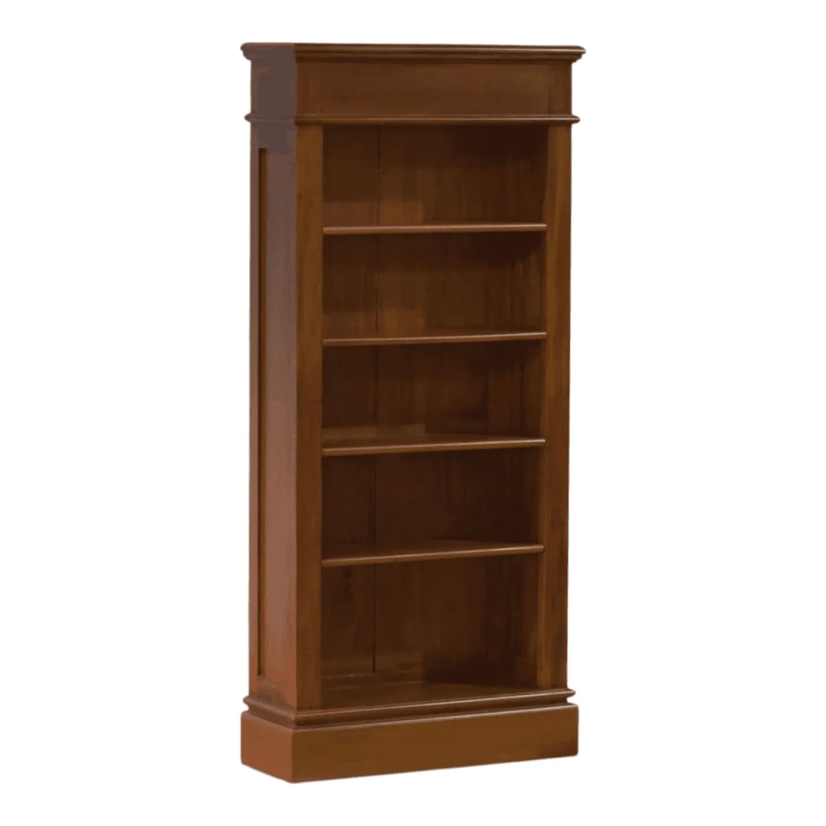 Organize your literary collection with the dignity it deserves in this tall stately bookcase Featuring five spacious shelves and a deep base this piece offers ample room for everything from heavy art books to delicate collectibles The crown molding and recessed side panels reflect a commitment to traditional woodworking techniques while the warm mahogany finish adds a layer of library-inspired sophistication Its narrow footprint makes it an excellent choice for hallways studies or living room alcoves where vertical storage is required without sacrificing floor space This is a piece built for the long haul designed to grow more beautiful as it collects the stories of your life