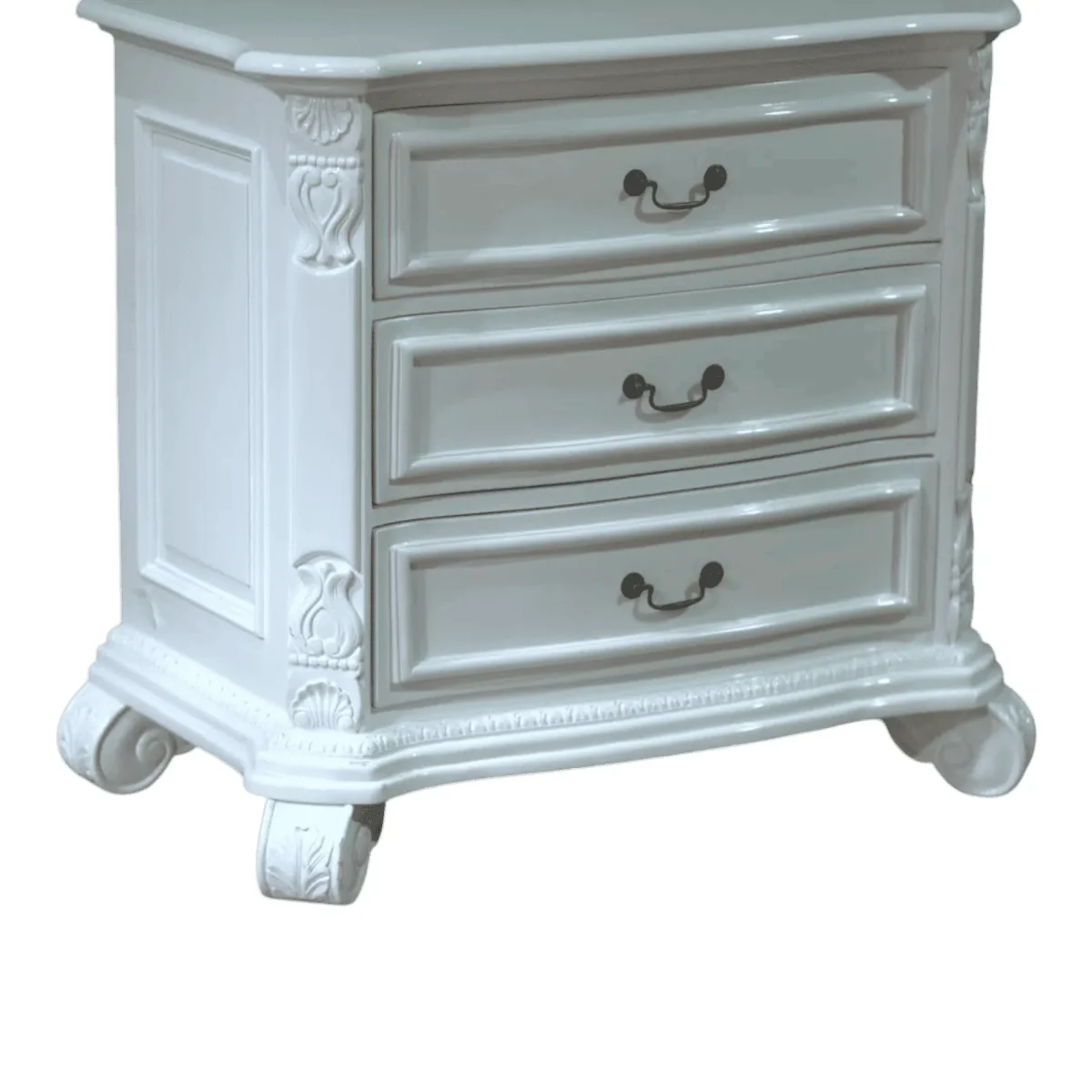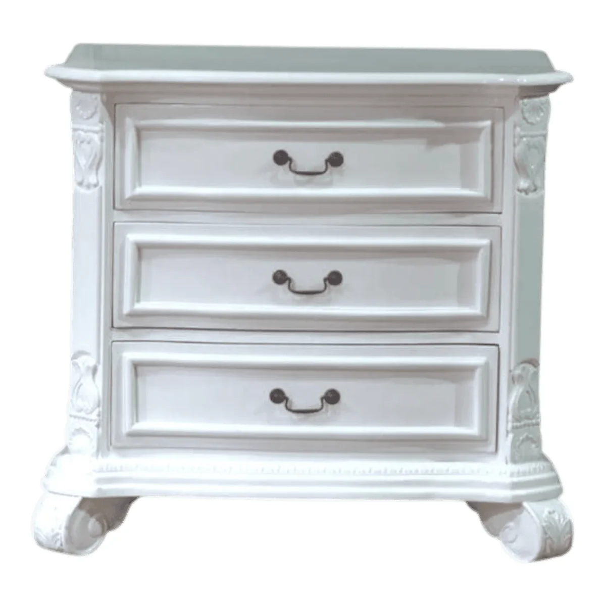 Commanding presence meets delicate detail in this robust yet refined triple-drawer commode designed to bring palatial storage to your master suite Each drawer face is framed with architectural moldings and anchored by antiqued drop-pull handles for a classic European feel The vertical stiles are hand-carved with floral medallions and acanthus leaf flourishes showcasing a commitment to traditional artisanal techniques Resting on substantial scrolled feet this piece exudes a sense of permanence and heritage while the pristine white finish keeps the look fresh and adaptable This cabinet serves as a magnificent focal point providing ample organization for fine linens or personal effects while elevating the room with its dignified Regency-inspired silhouette