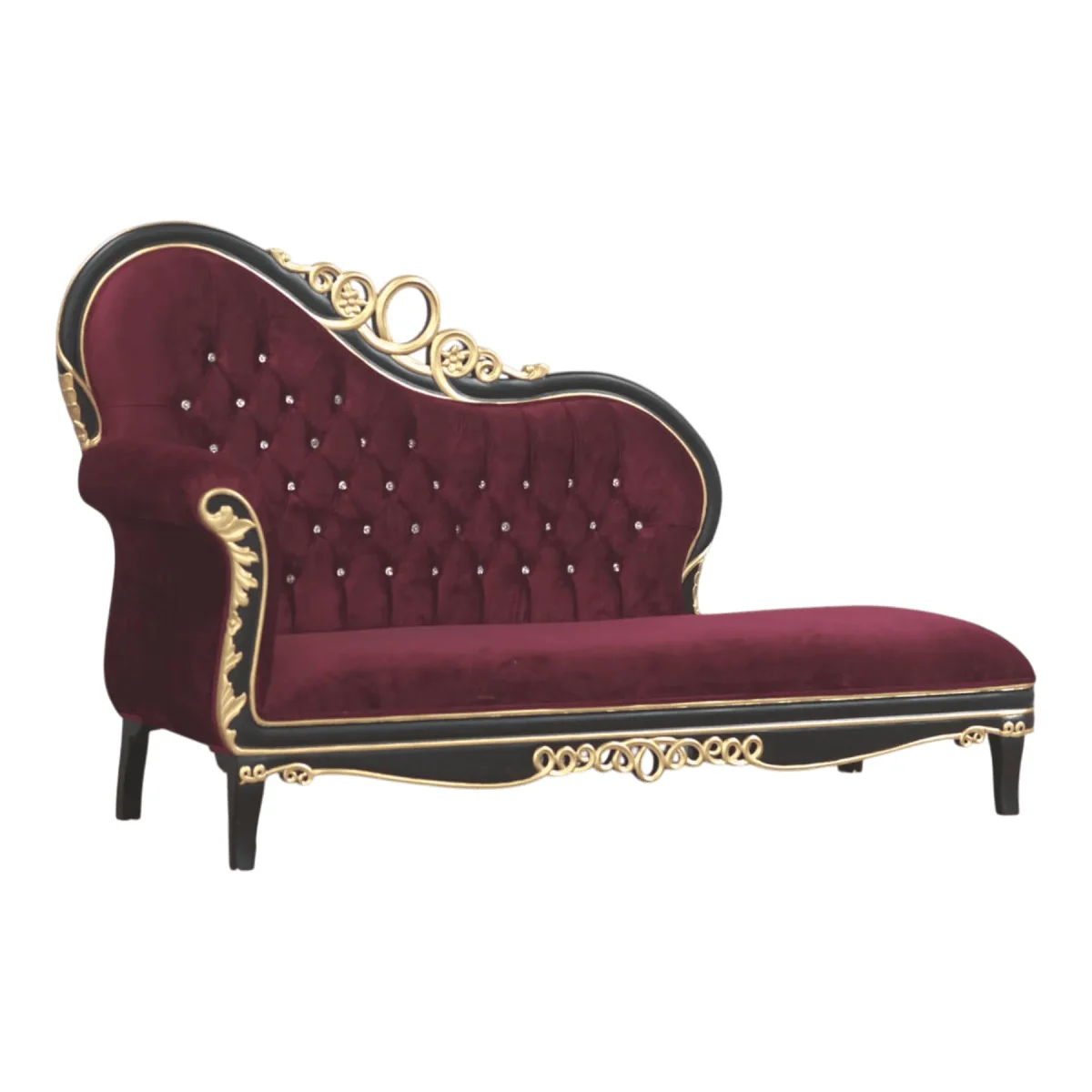 Indulge in the ultimate lounging experience with a chaise that radiates royal charisma and opulent comfort The deep burgundy velvet is accented with crystal-style button tufting that catches every ray of light creating a dazzling effect against the dark frame Gold leaf flourishes trace the elegant curves of the backrest and base adding a layer of sunshine to the moody aesthetic The asymmetrical design provides a comfortable slope for reclining making it the perfect spot for afternoon naps or leisurely reading Crafted from solid mahogany the frame is both strong and delicate in its detailing standing on short sturdy legs that ground the piece beautifully This chaise is more than just furniture it is a statement of personal luxury and an invitation to slow down and enjoy the finer things in a home filled with character