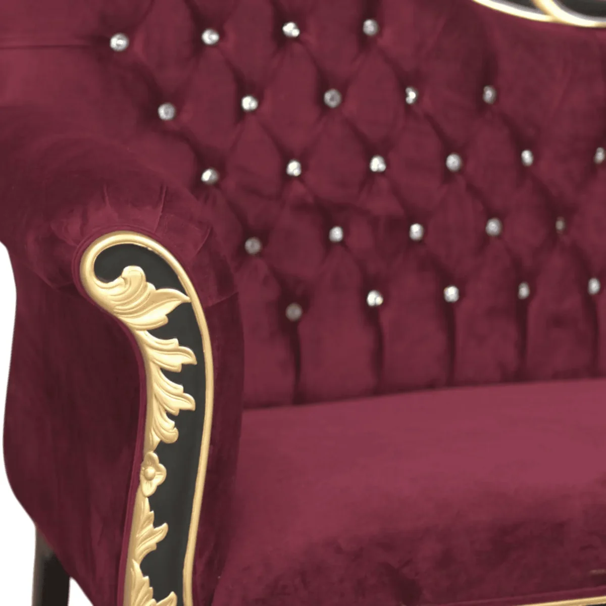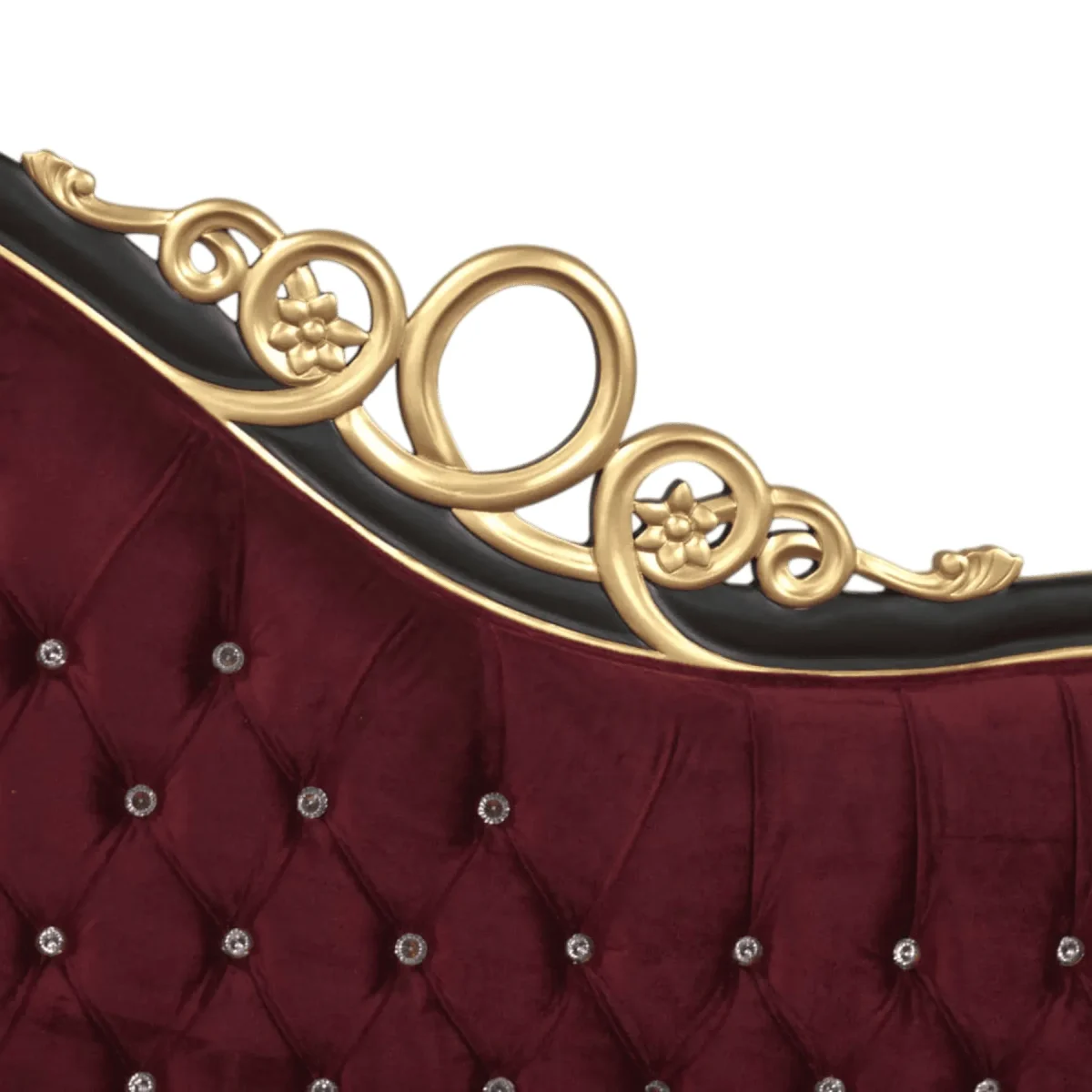 Primary Frame: Grade A Mahogany | Joinery: Solid Frame Doweling | Finish: Black and Gold Gilding | Upholster & Cushion: Deep Burgundy Velvet with Crystal Accents