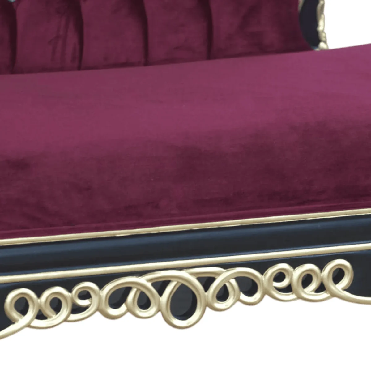 The chaise is designed to follow the natural curve of the human body while providing a high-impact visual profile The use of burgundy and gold evokes a sense of timeless European nobility
