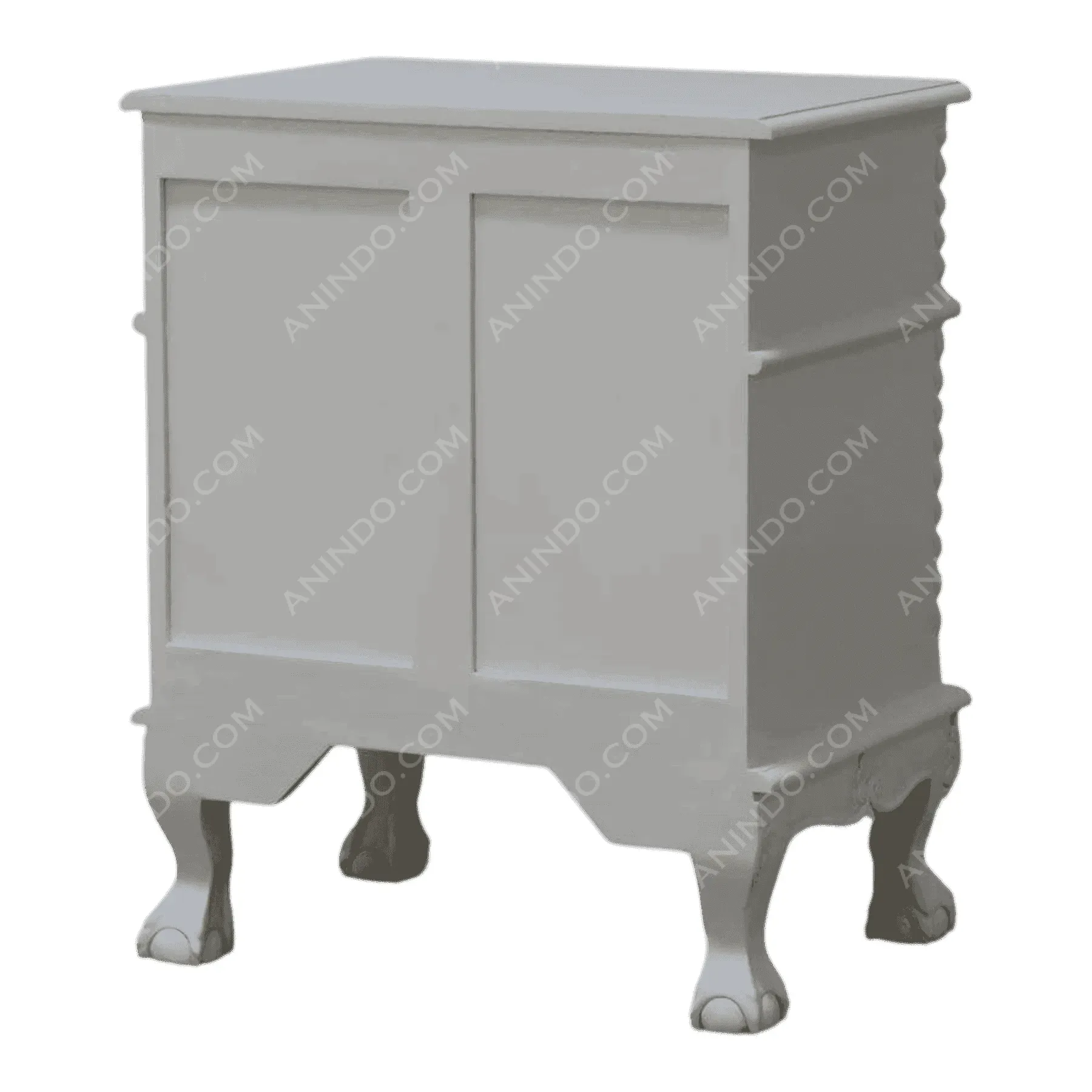 A charming and elegant nightstand that adds a touch of classic romance to the bedroom Finished in a soft antique white this piece features three drawers providing ample bedside storage Its unique character comes from the carved rope-twist molding that frames the drawers and the elegantly curved apron below The piece is supported by delicate cabriole front legs that terminate in distinctive carved claw feet