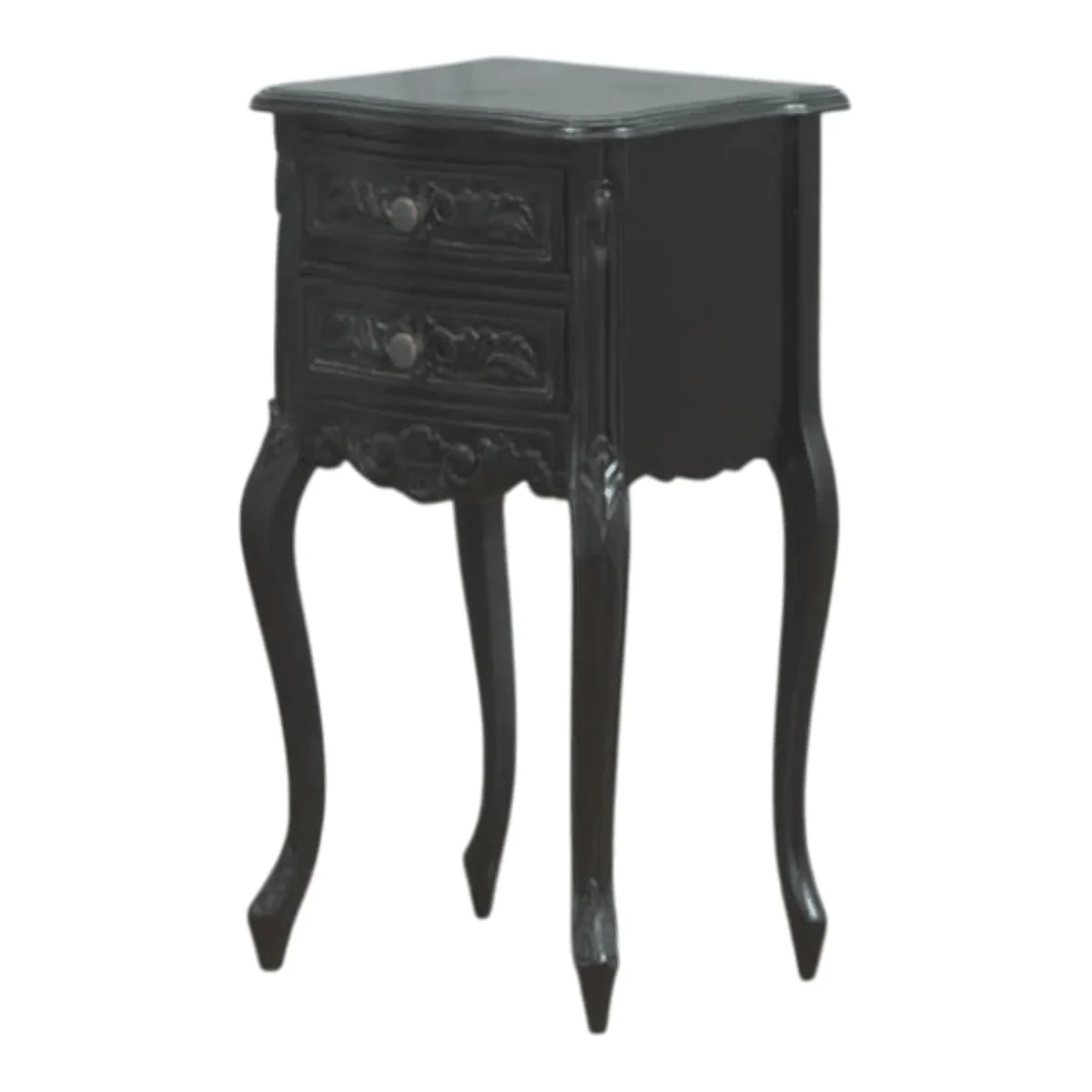 Add a touch of dark romance to your interior with the Noir Accent table This exquisite tall-standing side table features delicate hand-carved floral motifs across its two drawers and lower apron lending a feminine touch to its moody black finish The extra-long cabriole legs give the piece a sense of height and lightness allowing it to tuck perfectly into narrow hallways or serve as a chic telephone table in a living room corner Its petite proportions are deceptive as the solid mahogany construction provides a sturdy and lasting foundation This is a piece designed for the details—from the intricate scrollwork to the vintage-inspired knobs—creating a sense of curated history in any home