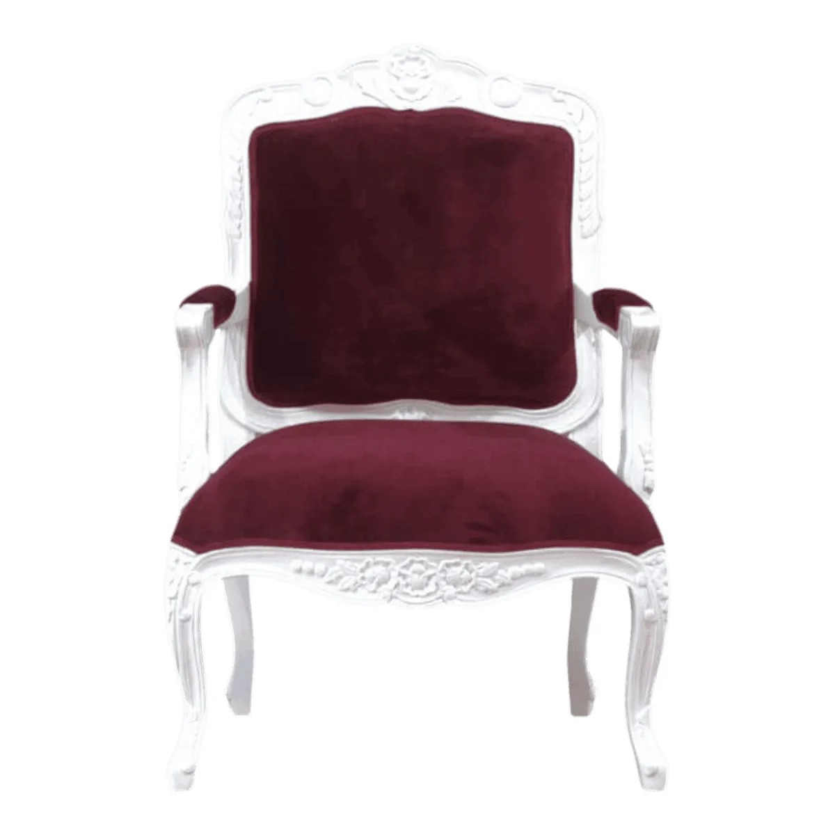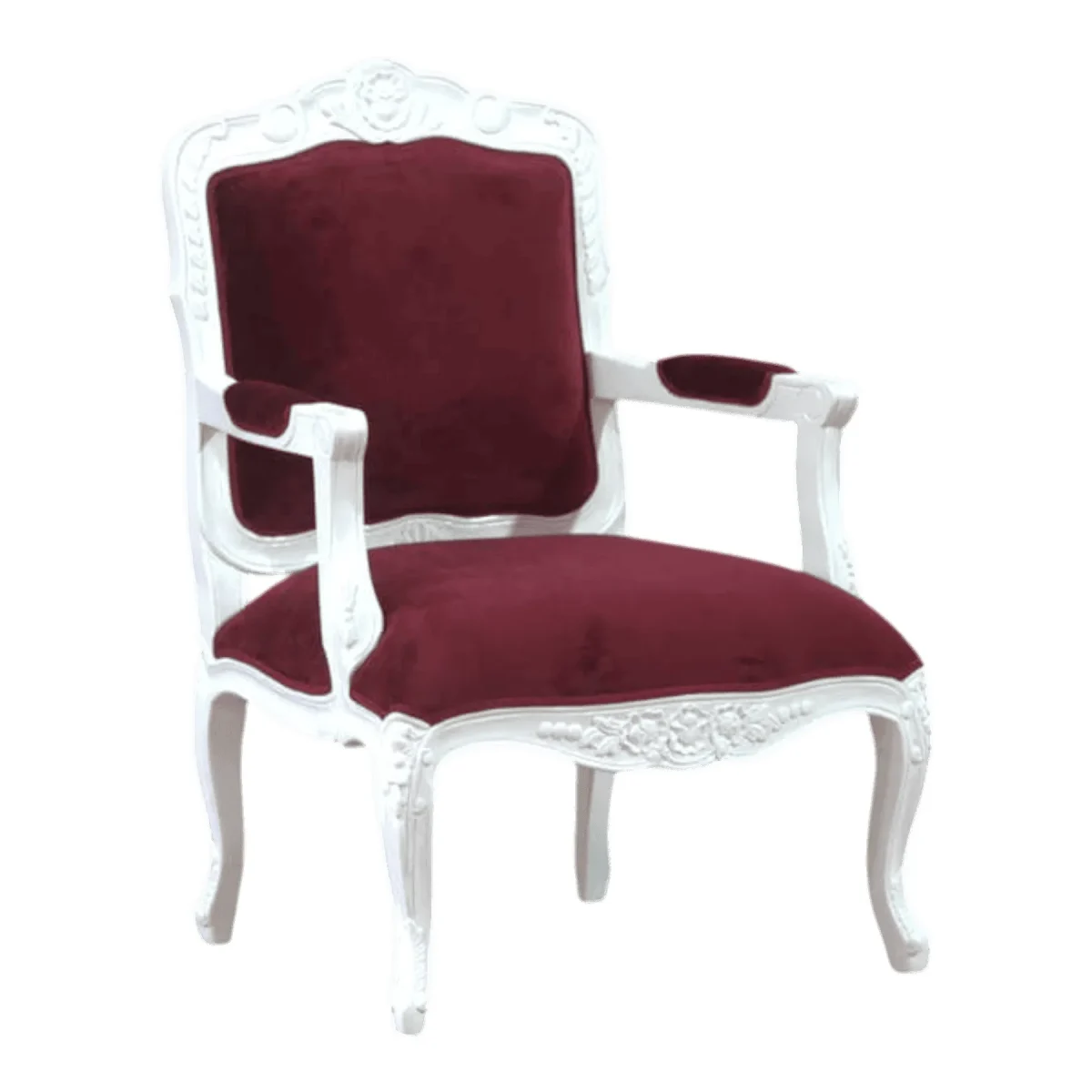 Immerse yourself in the lap of luxury with this breathtaking armchair featuring a striking contrast between its pristine white frame and deep burgundy velvet upholstery The hand-carved mahogany frame displays exquisite floral motifs and shell cresting that speak to a refined rococo influence while the cabriole legs provide a graceful silhouette that feels both light and sturdy This chair is designed to be the focal point of a formal sitting area or a luxurious bedroom corner offering a plush seated experience that does not sacrifice style for comfort The rich velvet fabric provides a sensory delight with its soft texture and deep color depth creating an atmosphere of royal elegance and historical charm Every detail from the padded armrests to the meticulously detailed apron has been artisan-crafted to ensure this piece remains a beloved staple of your home for years to come