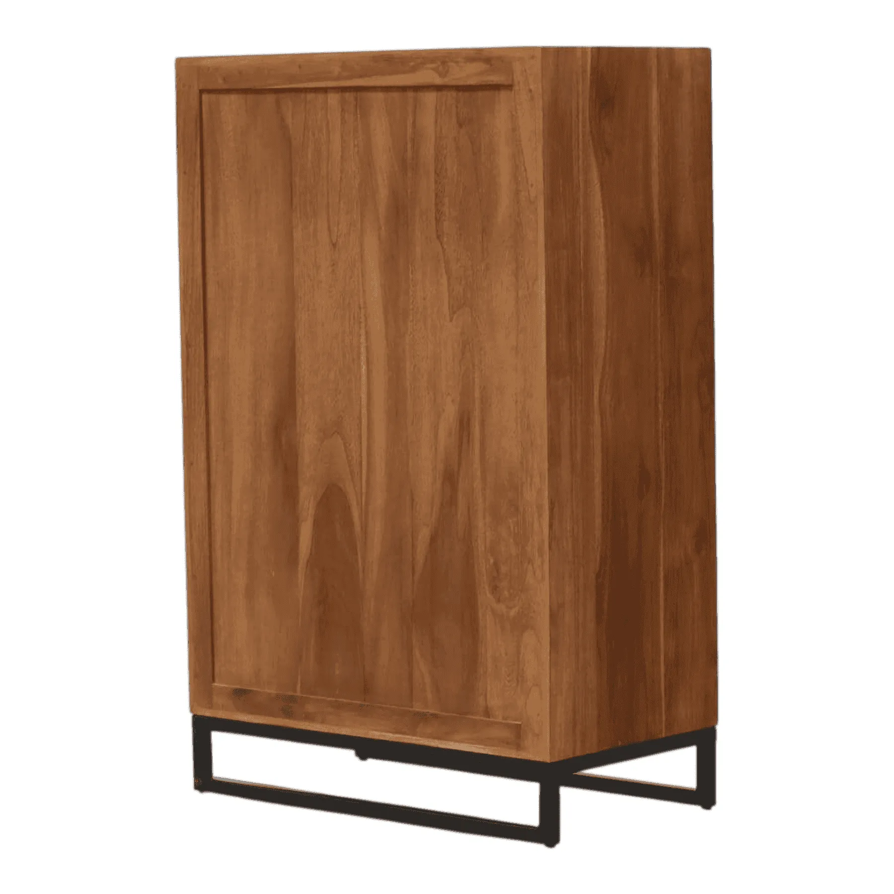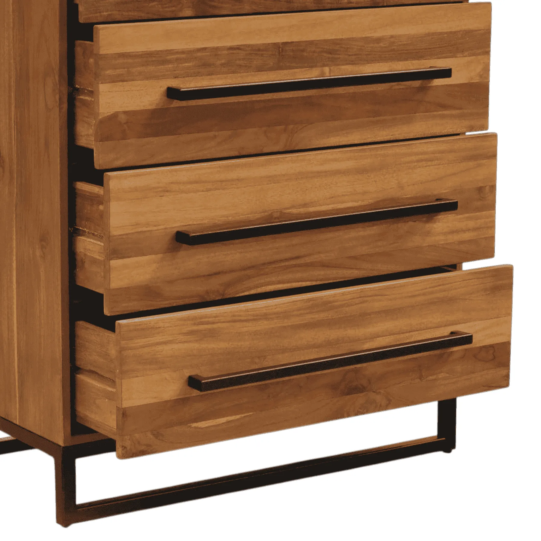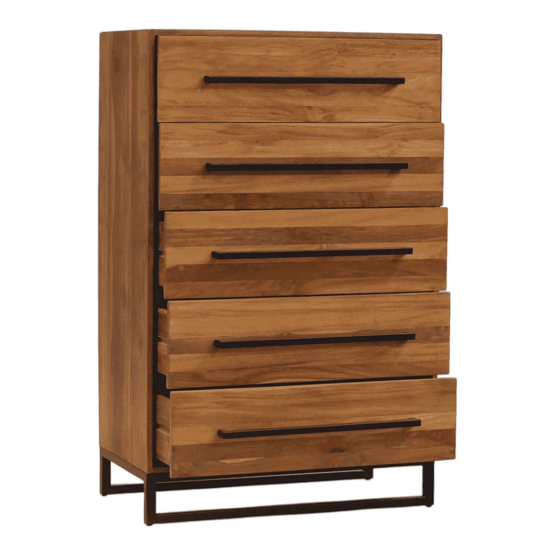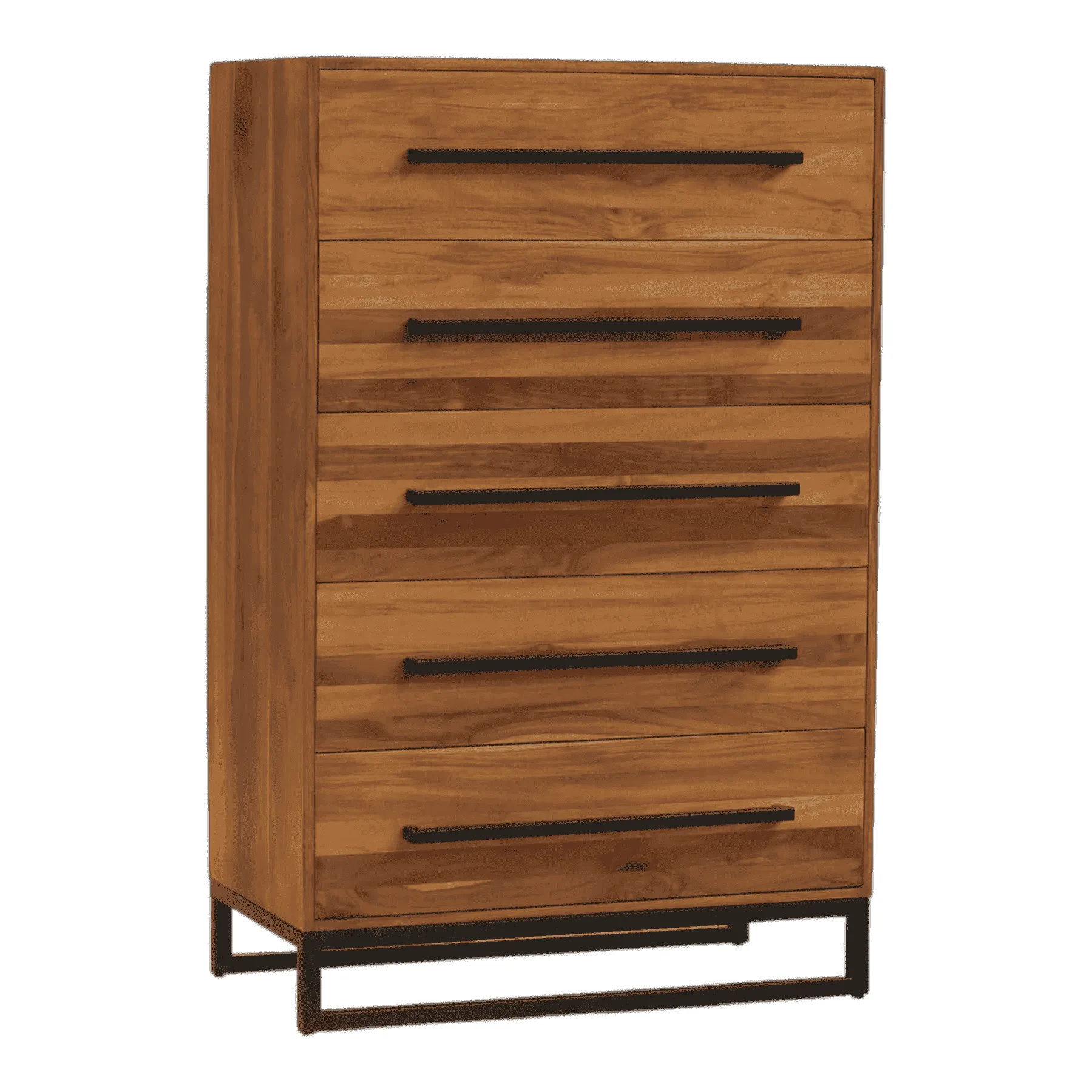 Meet the perfect solution for modern storage This five-drawer tallboy combines the warmth of natural teak wood with the sleekness of industrial design Five spacious drawers feature a beautiful horizontal grain, each accented by a long, minimalist black metal pull An elevated black metal base gives the piece a light, airy feel while ensuring stability It’s a functional and stylish addition to any contemporary bedroom