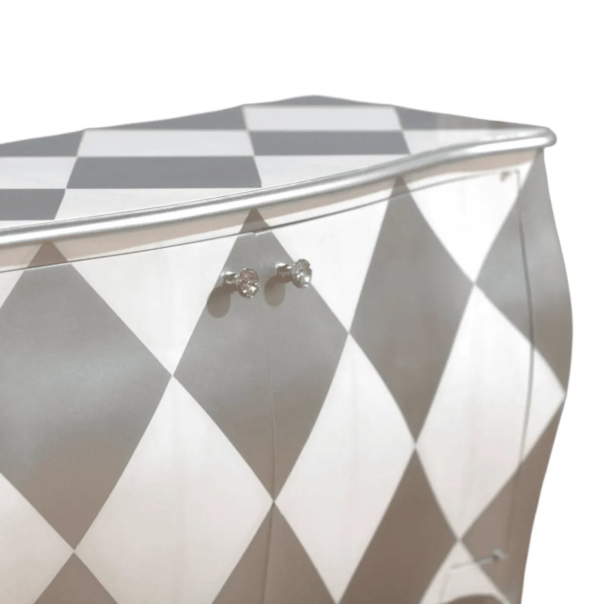 Make a bold artistic statement with this captivating Harlequin Sideboard featuring a striking diamond pattern that dances across its curved silhouette This piece is designed for those who view furniture as functional art offering a whimsical yet sophisticated touch to any interior space The elegant cabriole legs provide a graceful lift while the spacious interior keeps your essentials organized and out of sight whether in a formal dining room or a creative living area Its unique silver and cream palette reflects light beautifully adding a sense of movement and luxury to your home decor This sideboard is not just storage it is a conversation starter that brings a touch of theatrical flair to your everyday life