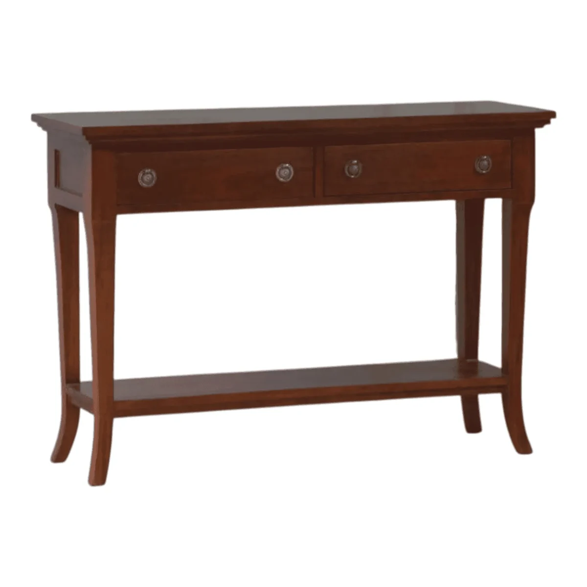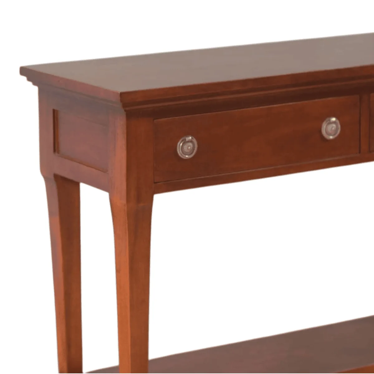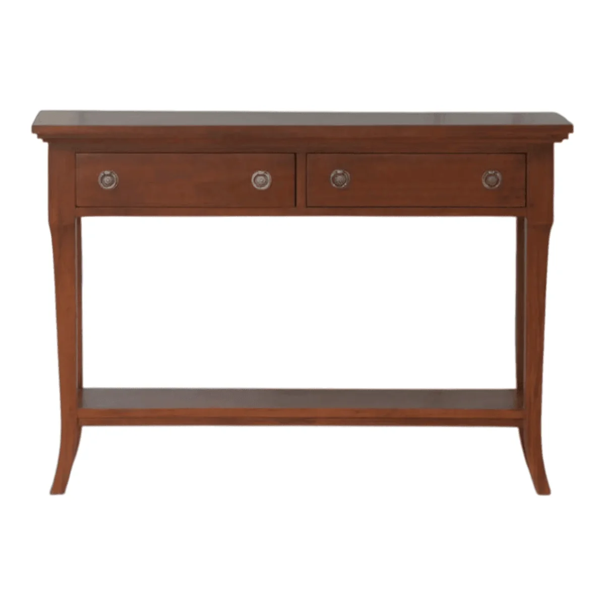 Bring functional sophistication to your home with this linear console table featuring a double-drawer configuration and a full-length lower gallery shelf The clean rectangular top is balanced by slender tapered legs that offer a contemporary lightness to the traditional wood construction Finished in a deep espresso tone this table provides two levels of display space making it perfect for showcasing art books or decorative baskets while keeping smaller items tucked away in the seamless drawers