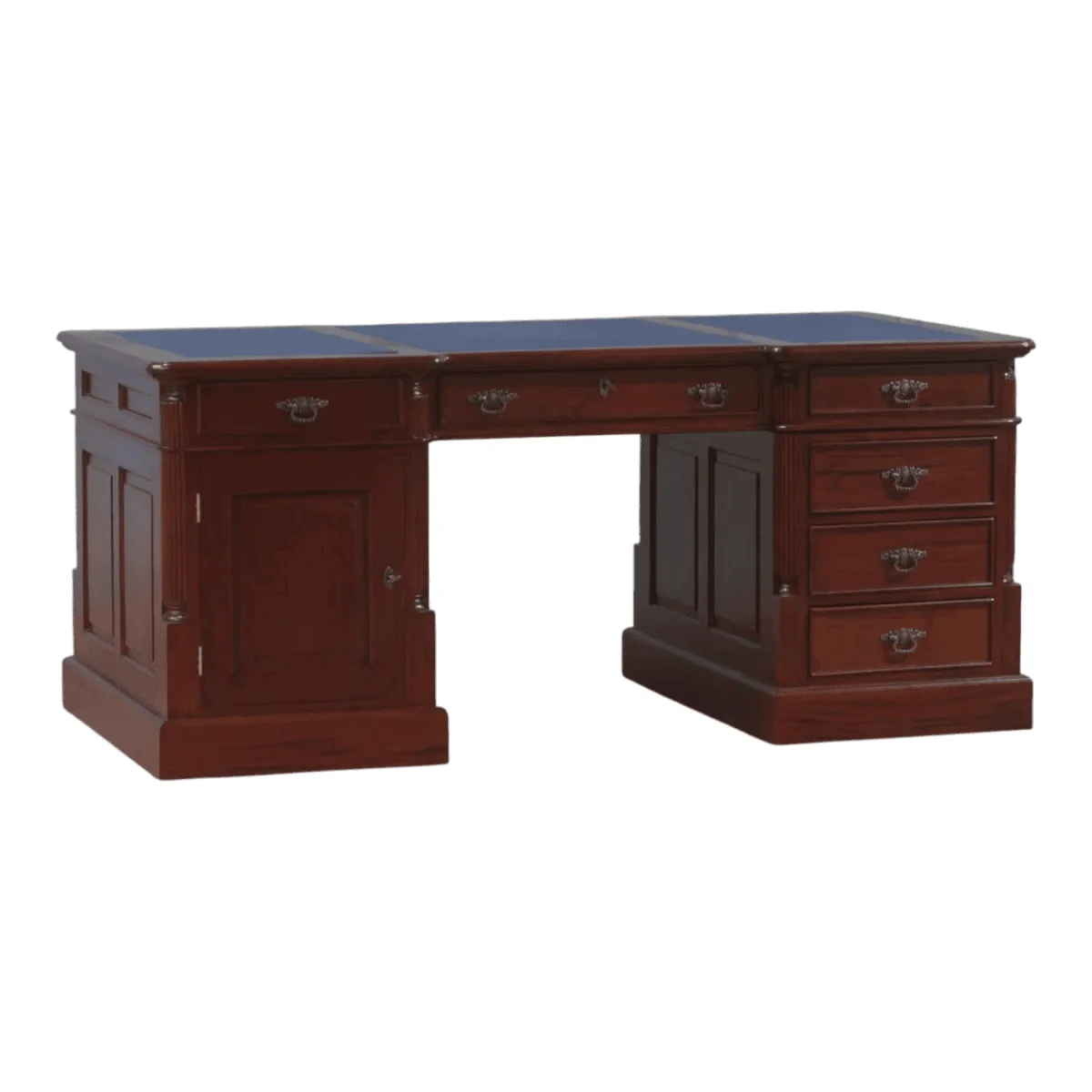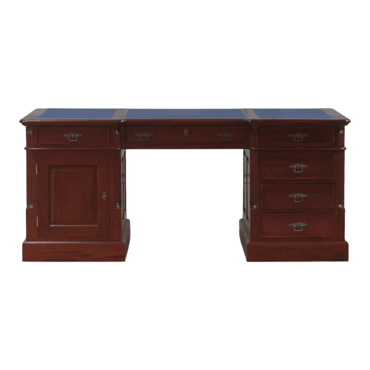 Command your workspace with this monumental executive partner desk a true centerpiece of professional elegance and power Crafted for the modern visionary who appreciates timeless aesthetics this desk features a dual-pedestal design that provides expansive surface area and substantial storage Hand-finished in a deep mahogany tone it exudes a sense of permanence and tradition the inset leather-style top offers a tactile writing surface while the intricate paneling and classic brass-style hardware speak to a legacy of craftsmanship Perfect for a high-end home office or a traditional boardroom this desk is not merely furniture but an heirloom-quality investment in your professional lifestyle