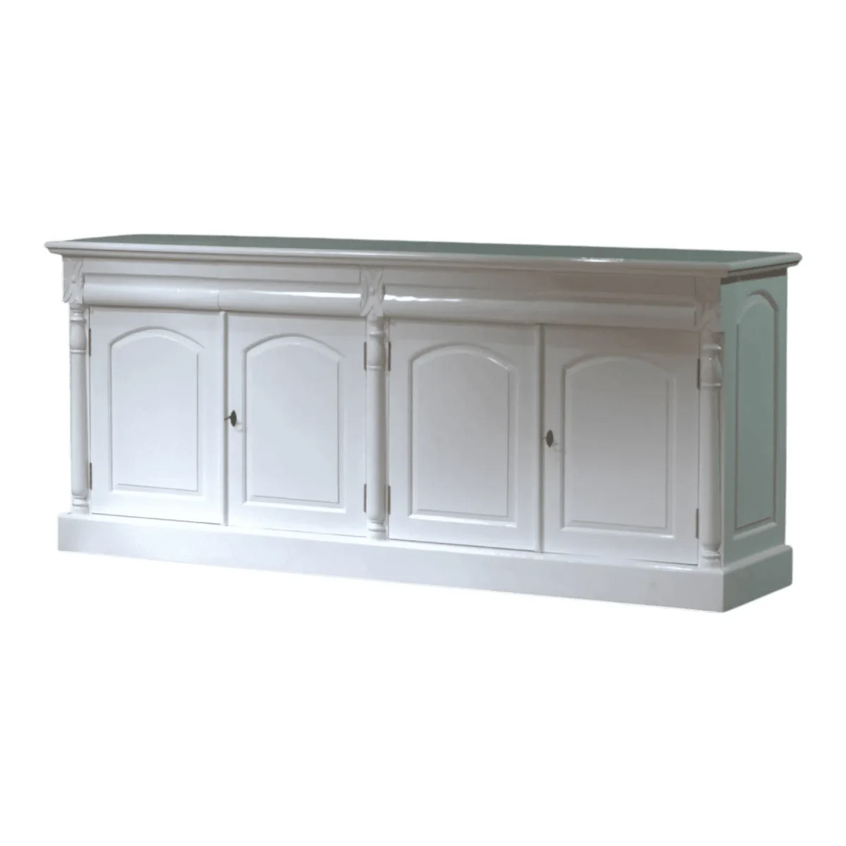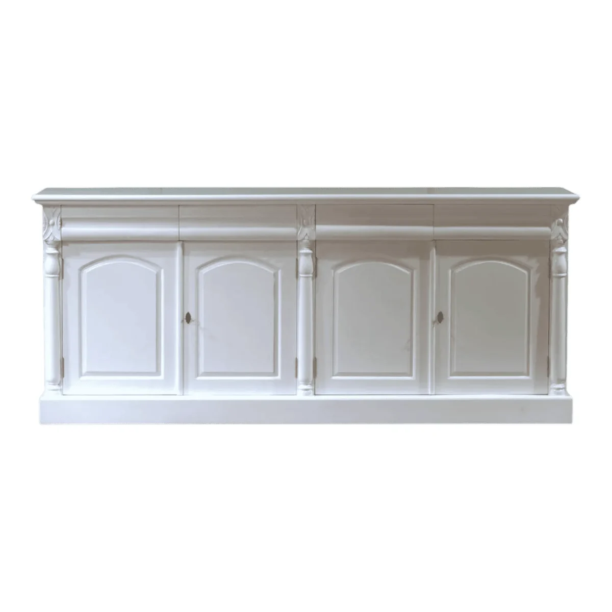 This elegant four-door sideboard brings a touch of neoclassical sophistication to your dining or living space Featuring intricate pilaster carvings and a pristine white finish it offers ample storage while serving as a stunning focal point The craftsmanship reflects a timeless aesthetic suitable for coastal or traditional interiors where light and airy textures are desired: Hand-finished details on the door panels and a sturdy plinth base ensure this piece remains a durable and stylish addition to your home for years to come