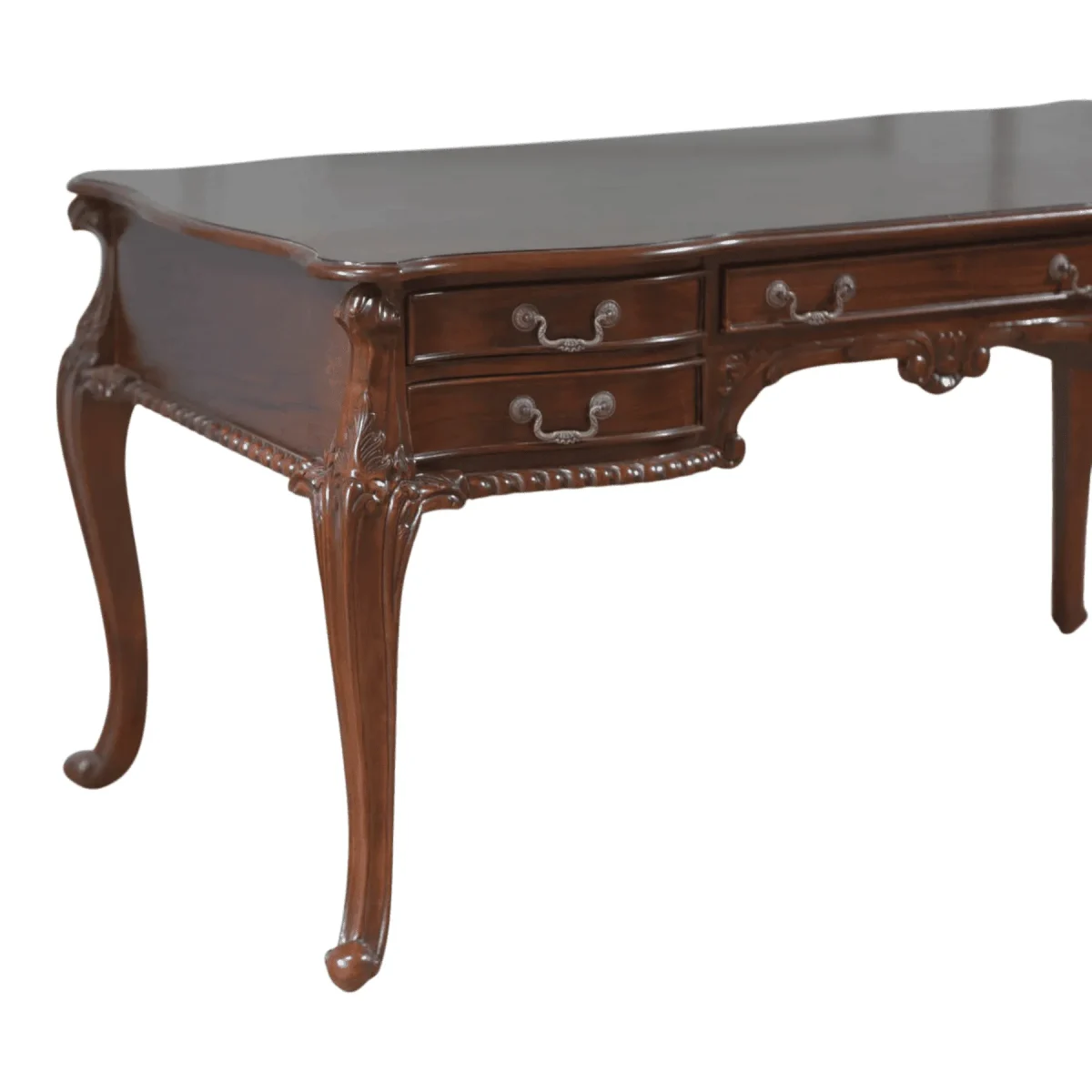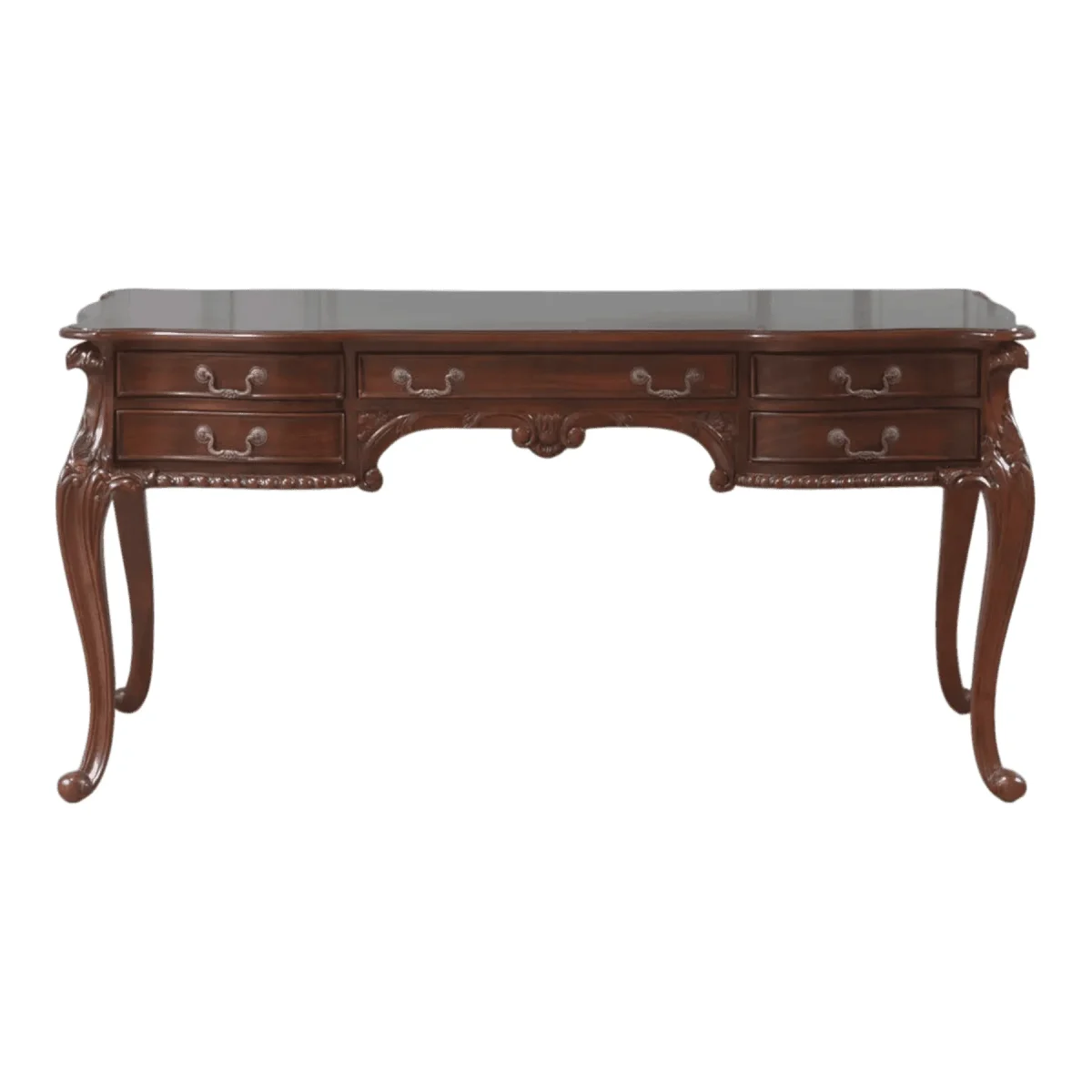 Command your workspace with the timeless authority of the Chancellor desk This expansive executive writing table is a masterclass in traditional woodworking featuring a serpentine front and five harmoniously integrated drawers for essential organization Every inch of the frame is adorned with classic details from the gadrooned edging along the top to the intricate acanthus leaf carvings on the sweeping cabriole legs The rich deep mahogany finish enhances the stately silhouette making it an ideal centerpiece for a home library or a professional executive office Designed for both productivity and prestige the desk offers a generous surface area while the elegant “knee-hole” design ensures comfort during long hours of study This heirloom-quality piece is built to endure serving as a legacy of fine craftsmanship for generations to come