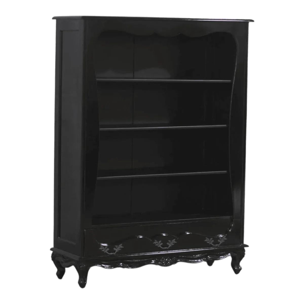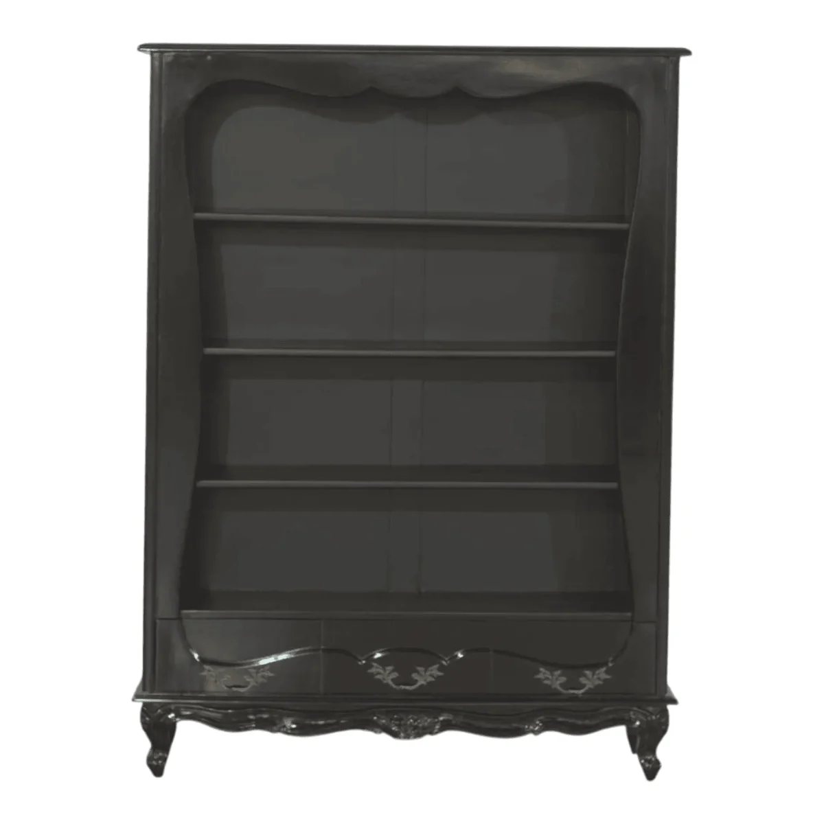 Organize your personal library within a structure that is as intellectually stimulating as the books it holds This tall elegant bookcase features an open front with a gracefully scalloped frame that draws the eye upward and gives your collection a curated museum-like appearance The deep black finish provides a sophisticated contrast for colorful book spines or metallic decorative objects making every shelf feel like a deliberate display of your personal journey Four levels of sturdy shelving are supported by a base with a hidden drawer for your most private documents or stationery needs Each corner and leg is treated with the same artisanal care as a piece of fine sculpture ensuring that even a functional storage item becomes a significant contribution to the room’s overall aesthetic It is a piece designed for the lifelong learner who believes that their environment should be as refined as their mind