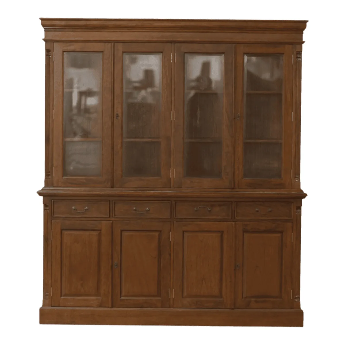This towering display cabinet is a masterwork of vertical storage designed to showcase fine china or a personal library with unparalleled grace The upper section features four glass-paneled doors that protect valuables while keeping them visible, framed by elegant fluted pilasters and a tiered crown molding Below four solid wood drawers and matching base cabinets provide concealed storage for linens or seasonal items ensuring your space remains organized and clutter-free Crafted from premium Hardwood this unit brings a sense of historical grandeur to dining rooms or studies offering a museum-quality backdrop for your most cherished collections