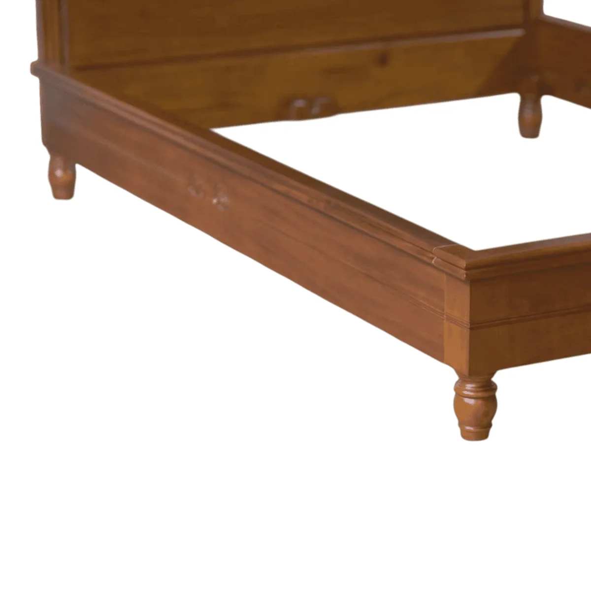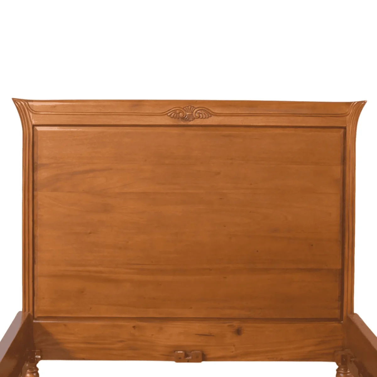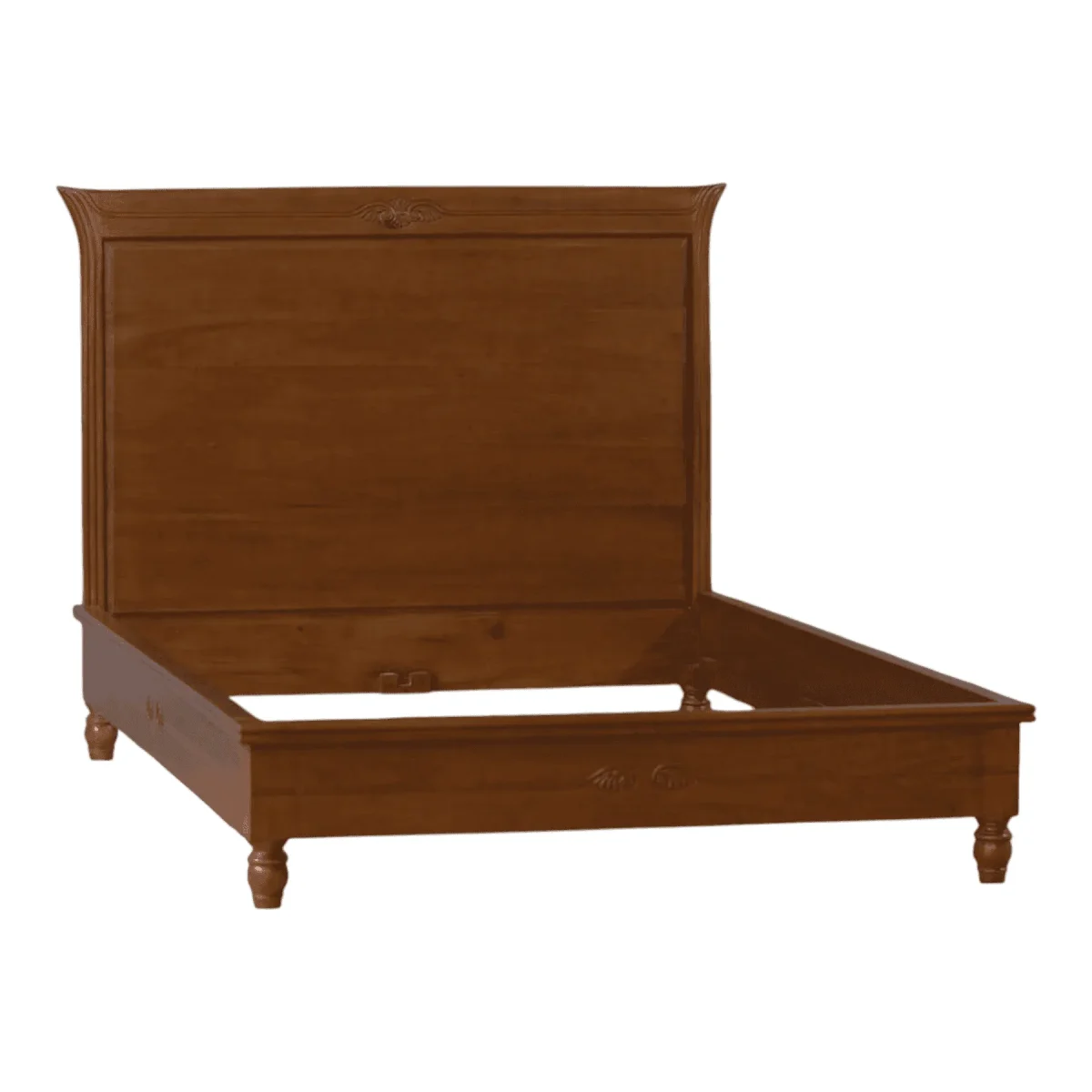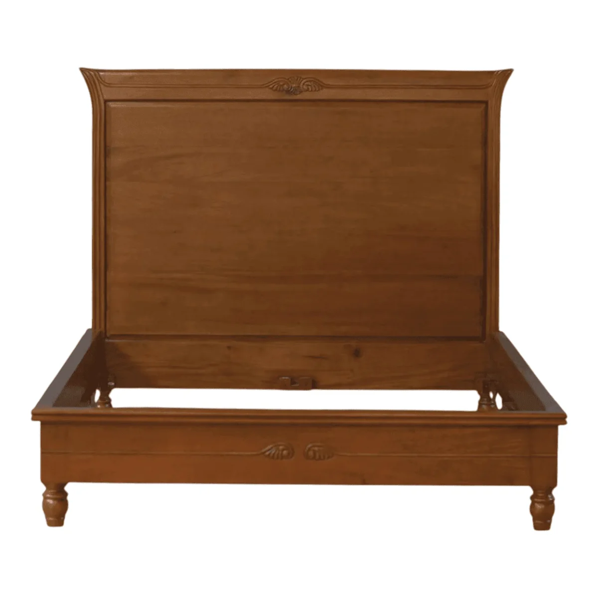 Embrace the warmth and longevity of natural timber with this stately panel bed frame that prioritizes clean lines and the inherent beauty of the wood grain Constructed from premium solid teak the bed features a high-impact headboard with subtle curved “wings” that provide a sense of architectural enclosure The rich mid-tone brown finish is achieved through a multi-step staining process that enhances the natural figure of the wood without masking its organic character A minimalist carved motif at the center of the headboard and footboard adds a touch of traditional artisan detail without overwhelming the contemporary silhouette This frame is built for structural permanence featuring a robust slat system and heavy-duty joinery that ensures a squeak-free and stable foundation for a lifetime of restful sleep