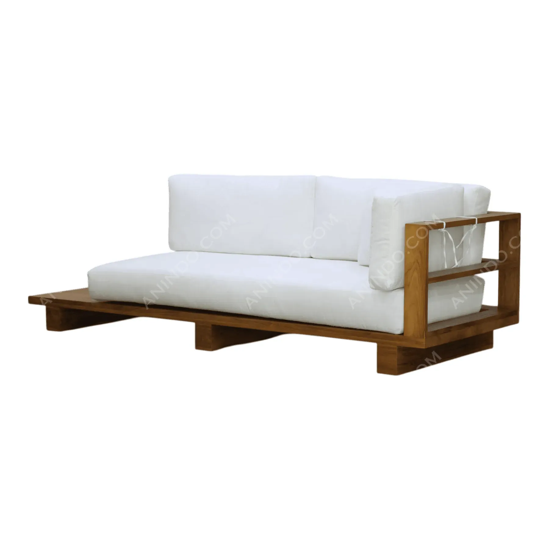Experience the ultimate in minimalist, modular luxury with the Asta Daybed Sofa This versatile piece is built on a low-profile, solid teak platform base that cleverly extends to one side, creating a seamless, integrated side table for your drinks or books Deep, sink-in cushions in a crisp, all-weather white fabric form a comfortable one-armed sofa section, complete with plush back pillows This is effortless, high-end design, perfect for lounging on a patio, in a sunroom, or a spacious, modern living area