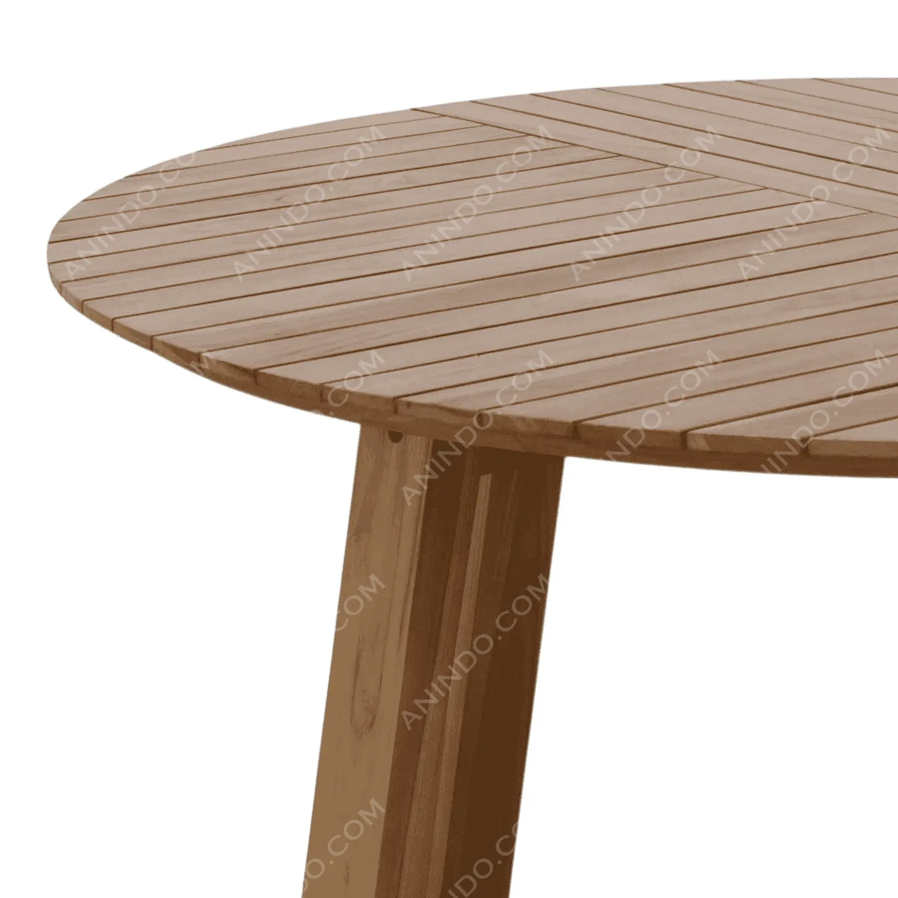 A versatile and modern table that blends clean lines with a practical slatted top Crafted from solid teak this round table is supported by a simple yet sturdy A-frame trestle base This design is equally at home on a covered patio for alfresco dining or in a breakfast nook for casual meals The slatted top allows for water drainage while the minimalist base provides ample legroom It’s a perfect example of functional modern design