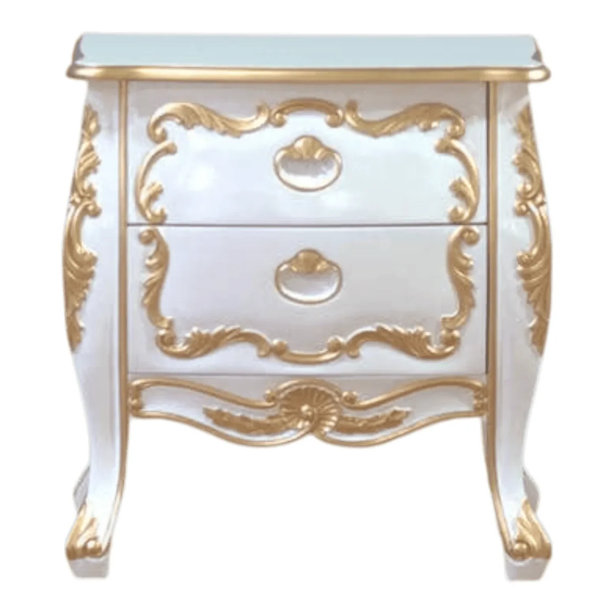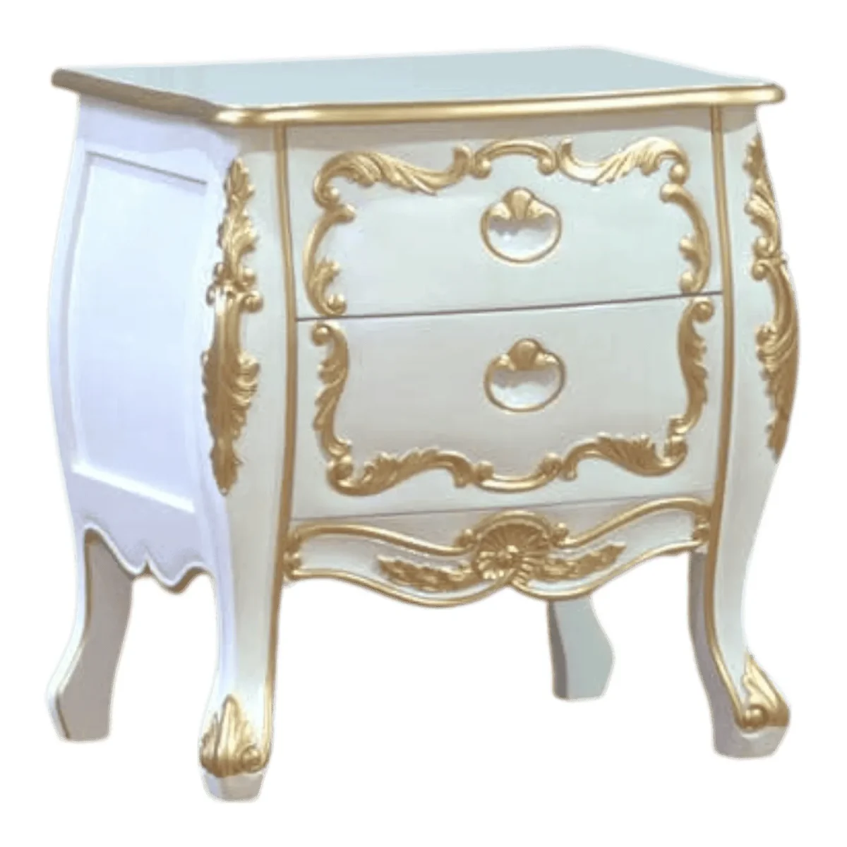Add a touch of whimsical luxury to your bedroom with this white and gold nightstand featuring elegant cabriole legs and ornate Rococo carvings that frame two deep drawers The soft white finish provides a clean backdrop for the shimmering gold accents which follow the fluid lines of the apron and drawer fronts creating a piece that feels light and airy yet substantial This nightstand is the perfect height for modern luxury beds and its smooth top provides a beautiful stage for a crystal lamp or a bouquet of fresh flowers Imagine waking up to the gentle gleam of gold leaf every morning in a room that feels like a boutique hotel suite curated for comfort and style This piece is an investment in artisanal beauty bringing a feminine and refined touch to your interior design while providing practical storage for your nightly routine