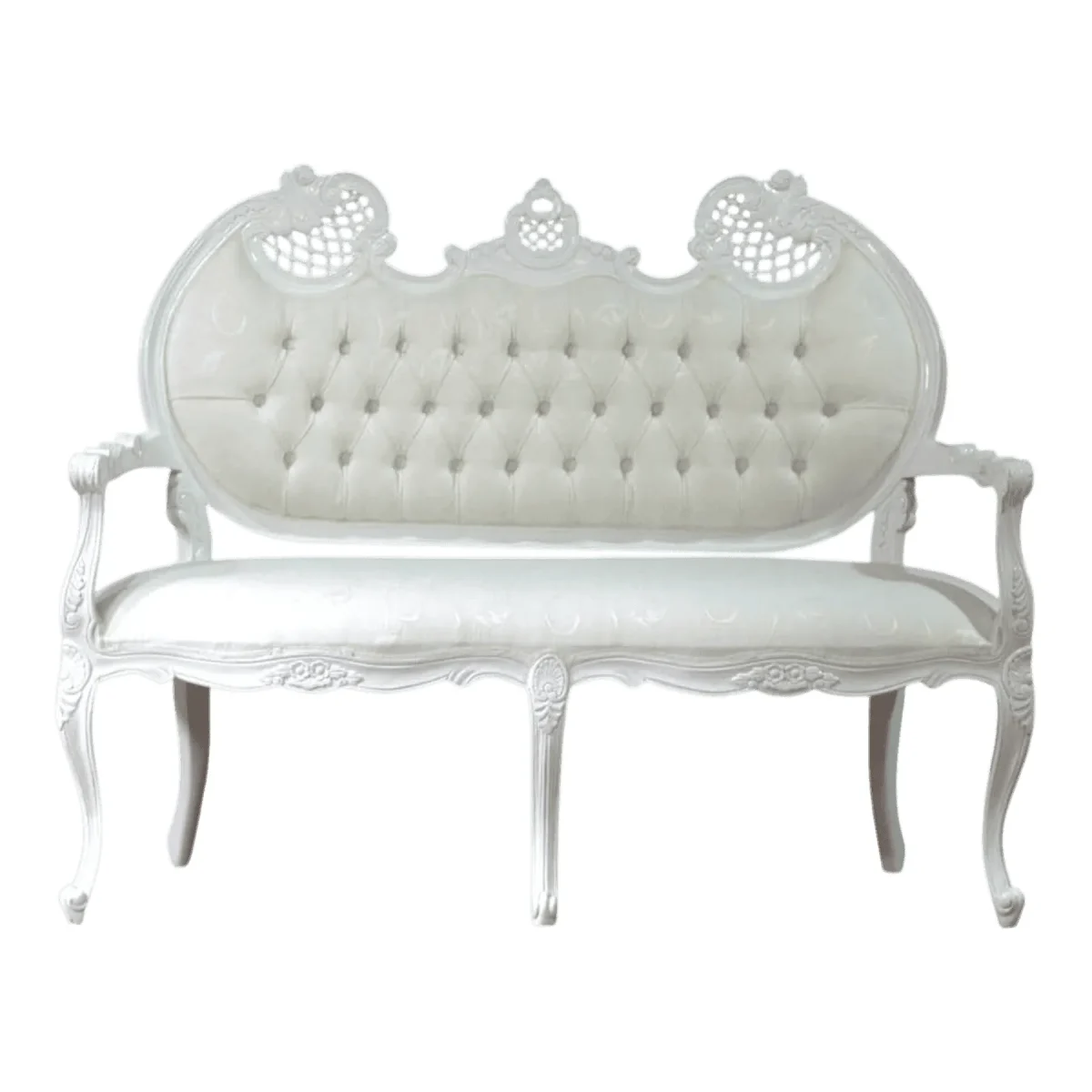 Experience the height of Neoclassical opulence with this exquisite handcrafted loveseat, a piece designed to transform any room into a palatial retreat The flowing silhouette features intricate hand-carved floral motifs along the apron and crest, culminating in three distinct crown-like lattice peaks that command attention Draped in a luminous white sateen fabric, the backrest showcases master-level diamond tufting that provides both structural depth and a plush sensory experience Every curve of the cabriole legs reflects a commitment to 18th-century French aesthetics, modernized with a pristine all-white finish This is more than seating; it is a statement of grace and status, offering an intimate space for conversation while serving as a stunning focal point for a formal drawing room or a bridal suite