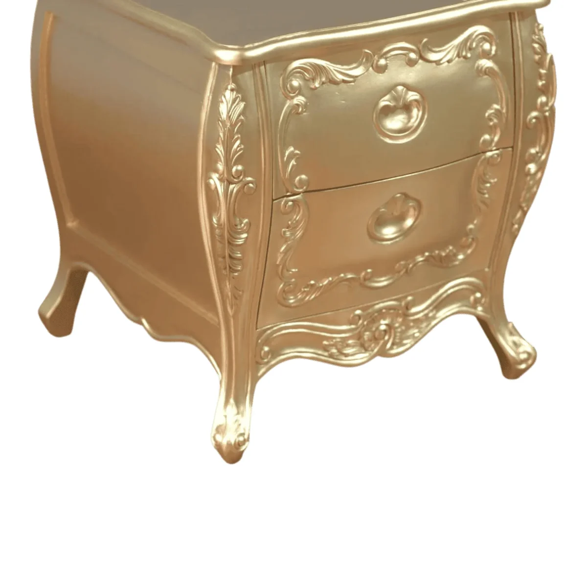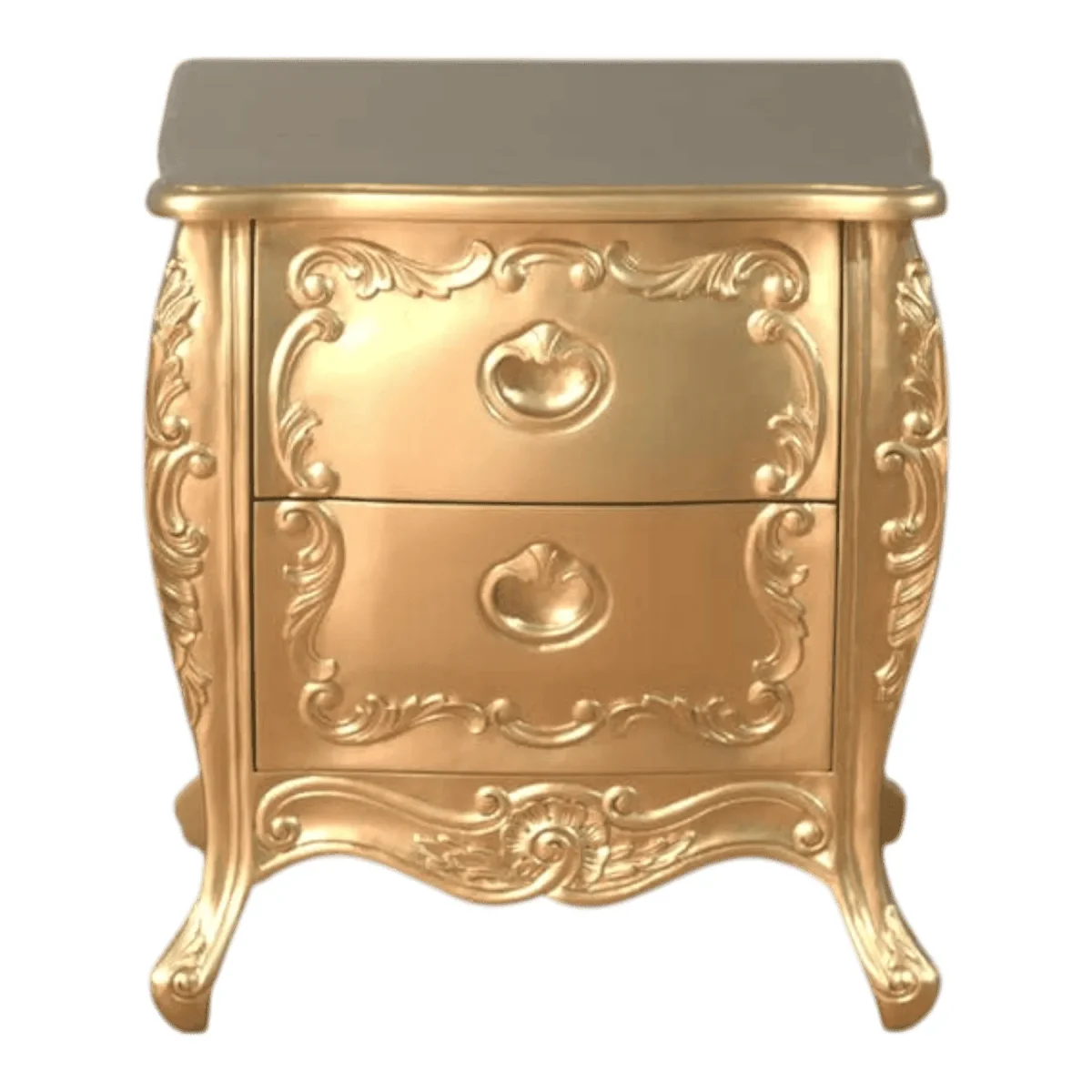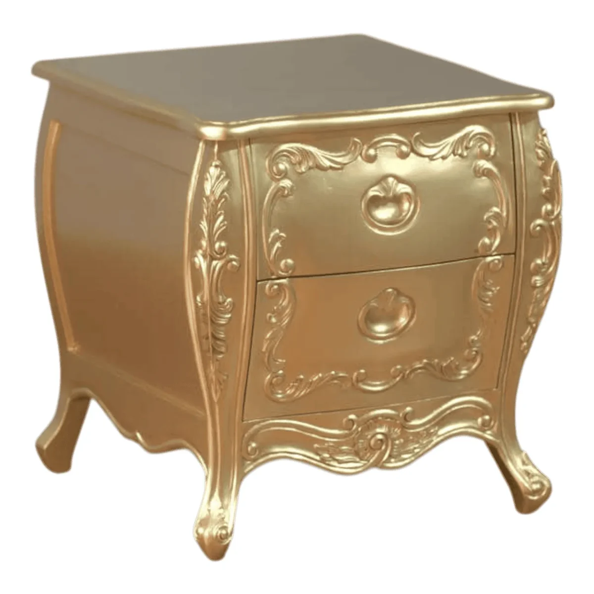 Infuse your bedroom with a glow of pure luxury using this stunning gold-finished bedside chest Featuring two drawers adorned with intricate scrollwork and elegant handles this piece is a testament to decorative artistry Its compact bombe shape and flared legs create a sense of movement and grace that lightens the visual weight of the metallic finish This nightstand is more than just a surface for a lamp it is a jewel-like accent that reflects light and adds a sense of warmth to your sleeping sanctuary The artisan-applied finish ensures a rich texture that feels expensive and unique making it the perfect companion for a plush upholstered bed or a grand wooden frame Embrace the glamour of traditional European design and elevate your nightly routine with a piece that feels like a treasure recovered from a royal estate