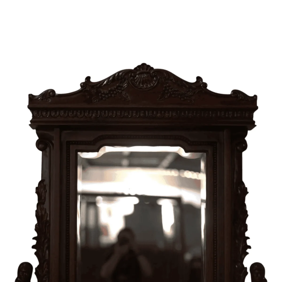 Create a breathtaking focal point in your master suite with this grand dressing mirror and vanity ensemble that evokes the splendor of an imperial palace dressing room, the massive central mirror is flanked by two intricately carved pedestals containing storage cabinets and drawers for all your beauty essentials and personal treasures, at the top a magnificent pediment features deeply carved floral cresting that draws the eye upward and adds a sense of regal height to the room, unique mermaid-like sculptural figures flank the mirror glass providing an artistic and whimsical touch that sets this piece apart from ordinary furniture, the rich dark wood finish emphasizes the high-relief carvings and ensures that this vanity will become the most talked-about piece in your home while providing a functional space for daily preparation and self-care rituals in an atmosphere of total luxury