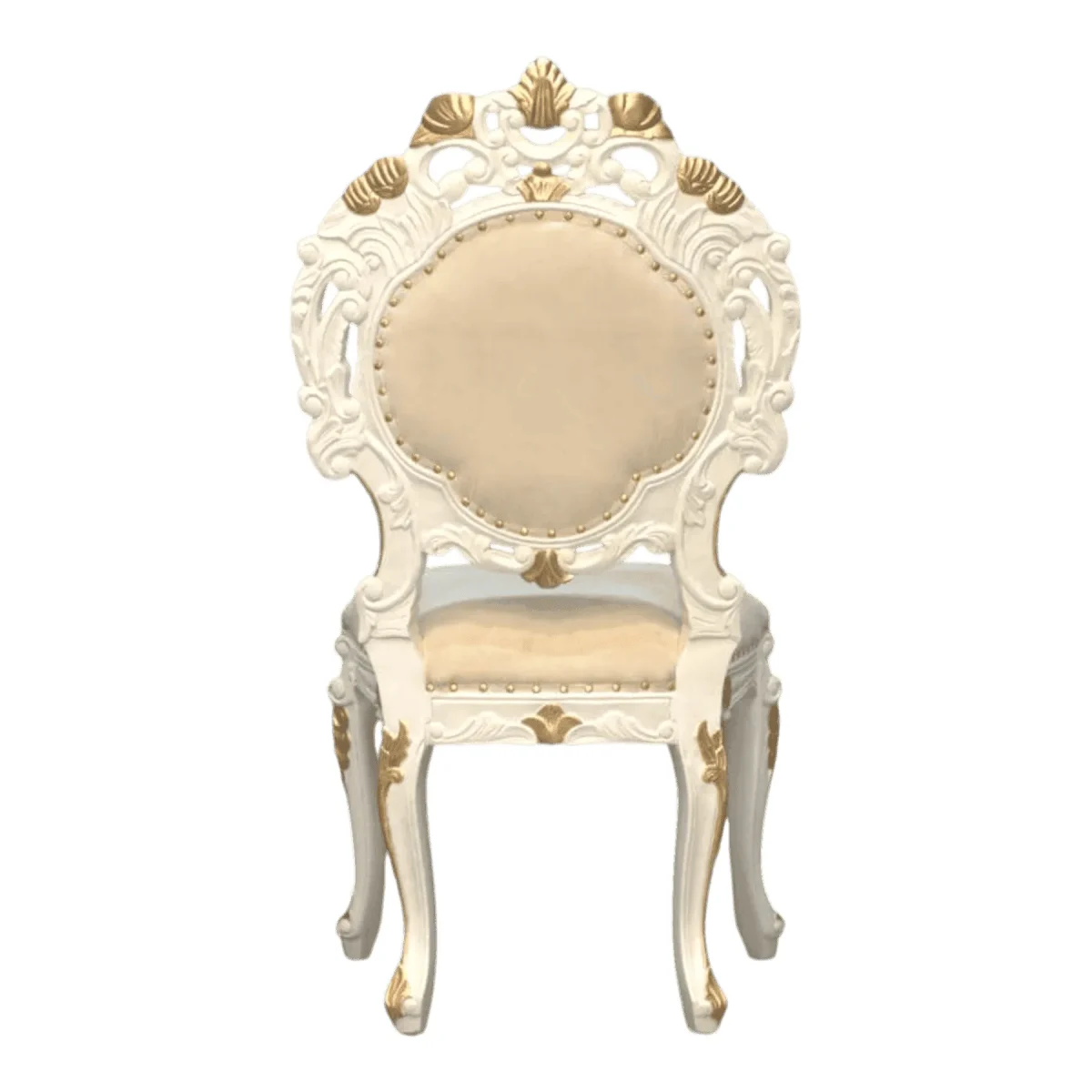 A feast for the eyes this dining chair pairs a creamy white lacquer with lavish gold accents to create a seat fit for a palace The oval backrest is framed by elaborate scrollwork and floral motifs which continue down to the apron and cabriole legs The plush velvet upholstery ensures comfort during long dinners making this not just a piece of art but a functional invitation to luxury dining experiences