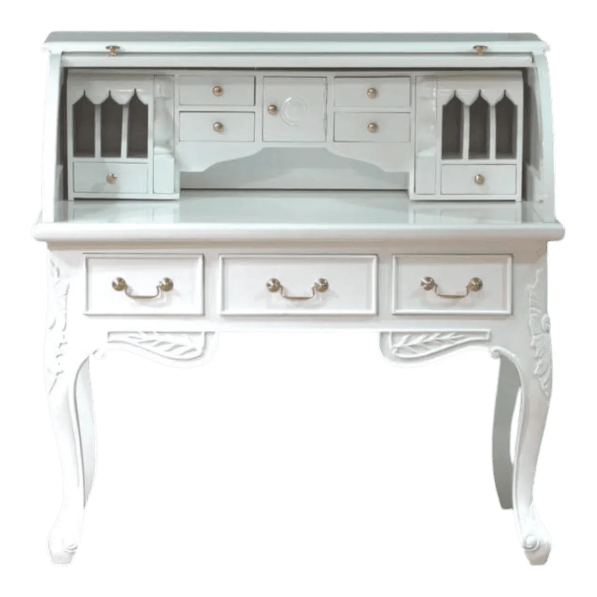 Experience the charm of traditional correspondence with this beautifully crafted roll-top desk finished in a clean ivory white that brightens any study space The smooth rolling tambour door opens to reveal a complex network of small drawers and pigeonholes designed to organize stationery and personal treasures with ease Supported by elegant cabriole legs and featuring hand-carved floral accents this desk offers a perfect blend of feminine grace and functional utility Whether used as a laptop station or a dedicated writing desk its classic silhouette and durable mahogany construction ensure it remains a cherished piece for generations to come The lower drawers provide ample storage for larger items while the polished surface offers a smooth writing experience
