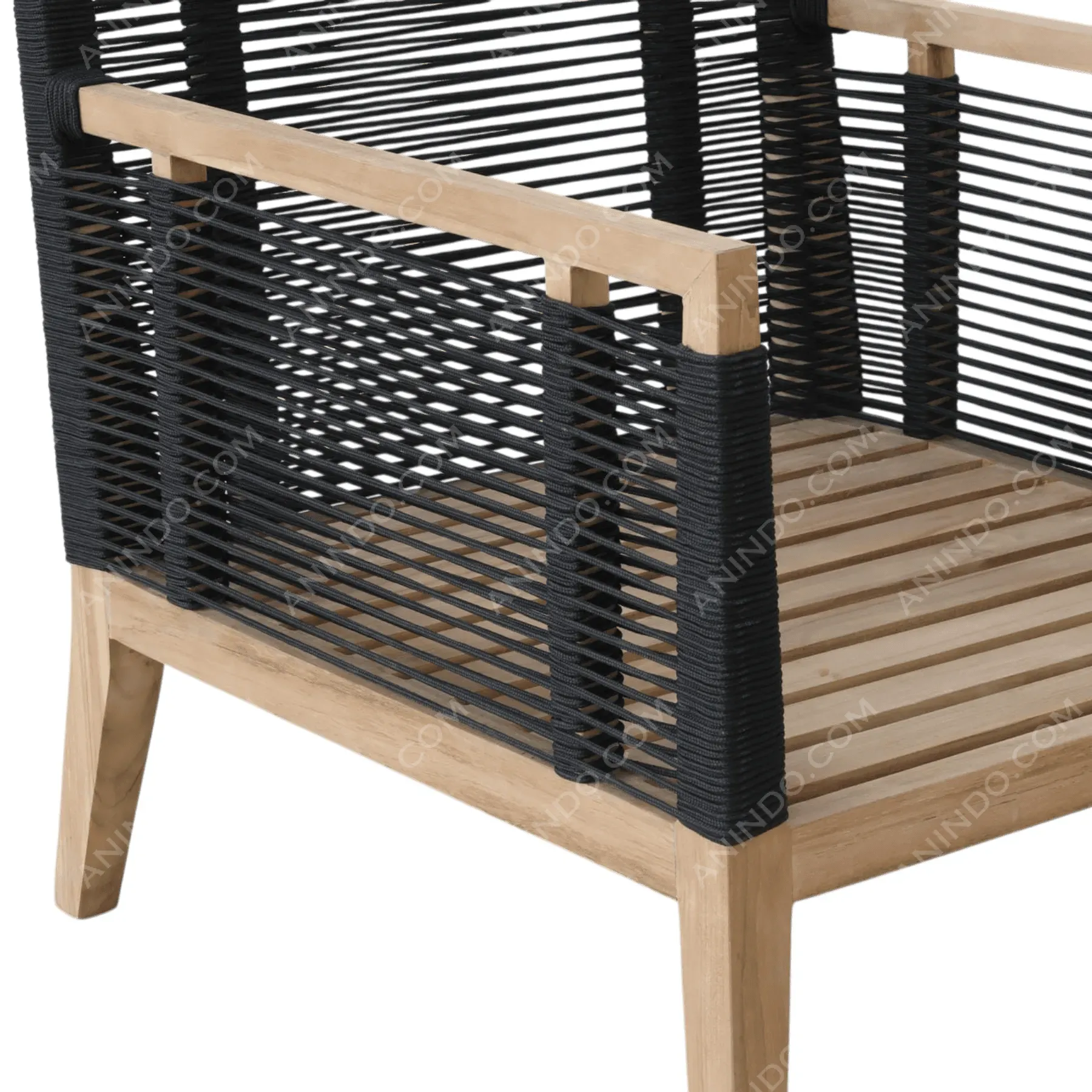 This lounge chair frame is a striking example of modern material-blending A solid teak base with a slatted seat supports a back and arms fully enveloped in taut, black all-weather rope The rope provides both the structure and the style, wrapping the arms and forming a resilient, comfortable back This creates a graphic, textural contrast to the warm wood, ready for custom cushions or to be used as-is