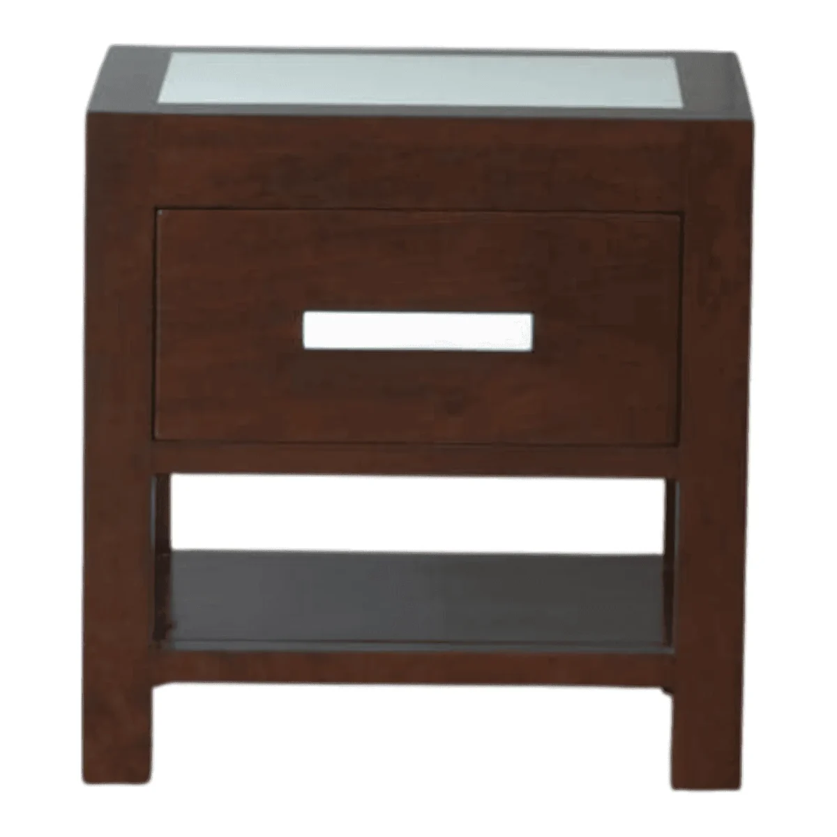 For those who appreciate the beauty of clean lines and rich wood tones this nightstand offers a perfect blend of modern minimalism and rustic warmth The blocky sturdy frame is finished in a deep walnut stain that highlights the natural grain of the mahogany heartwood A single large drawer provides ample concealed storage featuring a sleek horizontal silver handle that emphasizes the piece’s contemporary edge Below the drawer an open compartment offers a perfect spot for easy-access items or decorative accents The inset glass top adds a layer of protection and a touch of sophistication reflecting light and making the dark wood pop This piece is ideal for a modern loft or a transitional bedroom where simplicity and quality materials are valued above all else