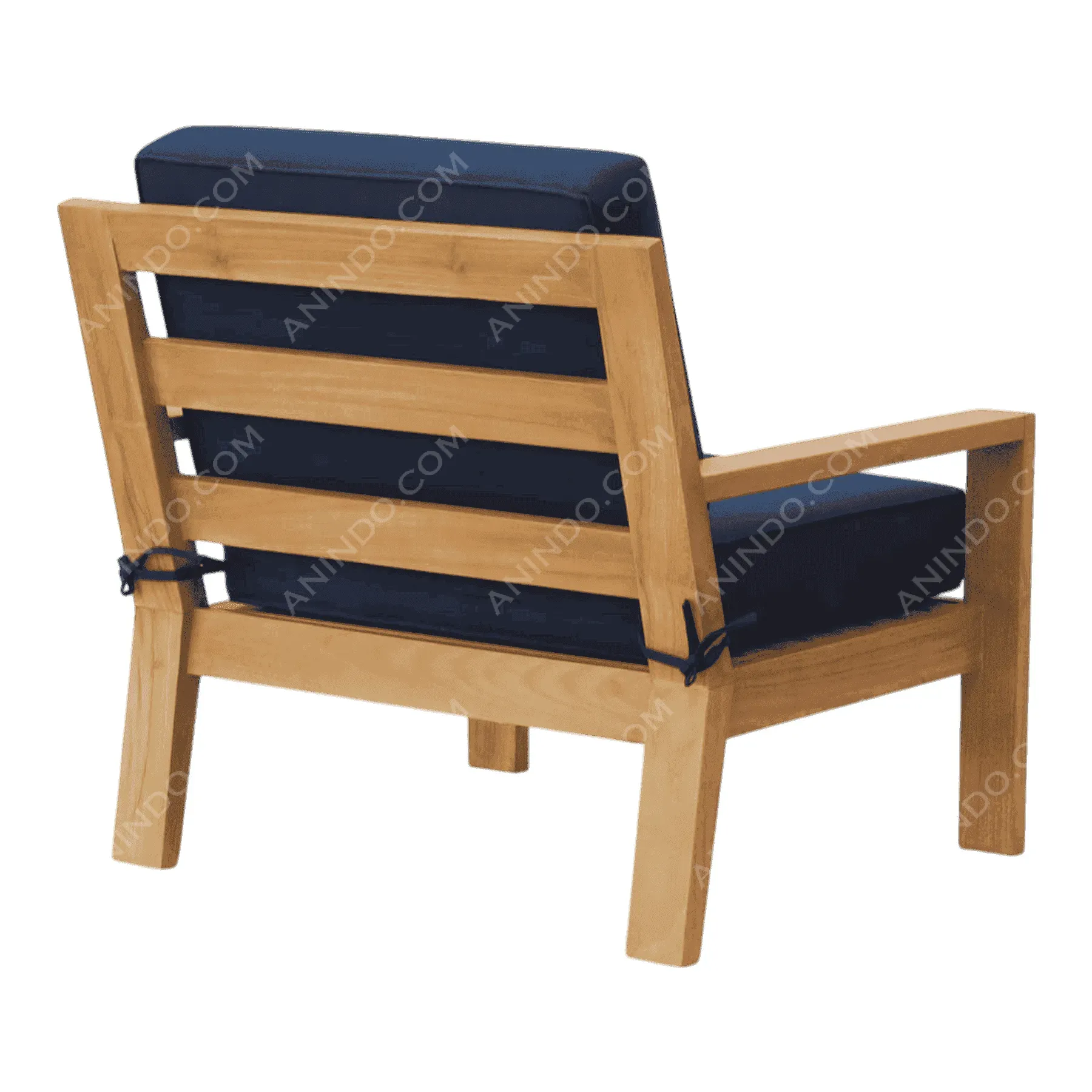 Primary Frame: Solid Teak Wood | Joinery: Mortise and Tenon | Finish: Natural Teak Oil | Upholster & Cushion: High-Density Foam with Navy Blue Outdoor-Grade Fabric