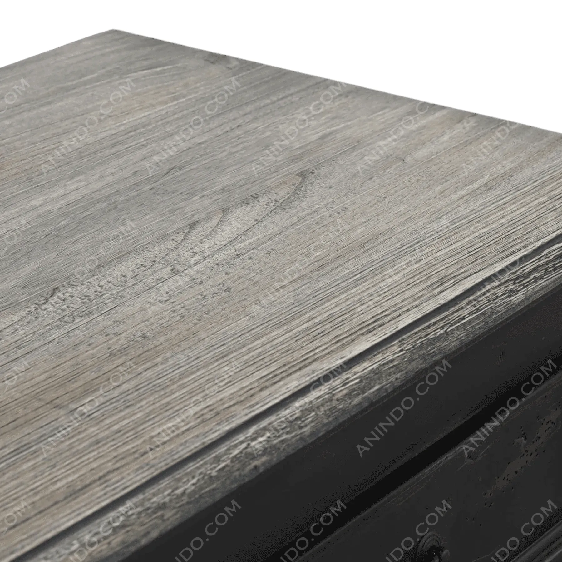 Deep Matte Black with heavy crackle distressing, revealing warm wood/red undertones, with a light-colored top surface