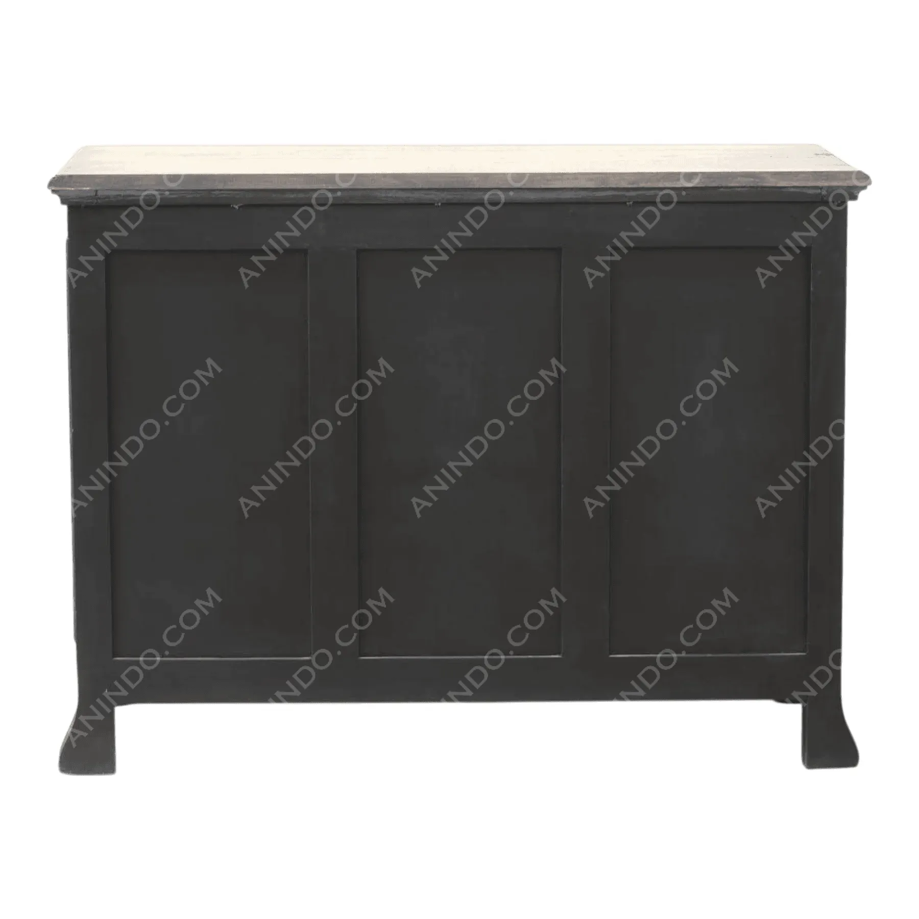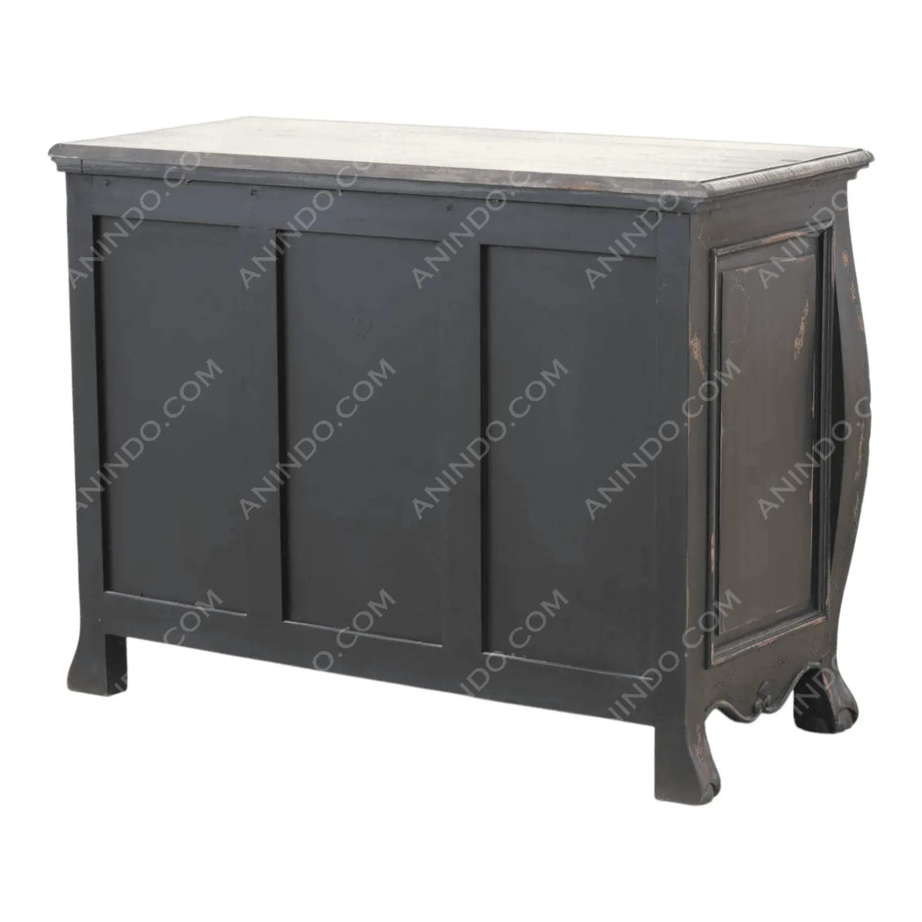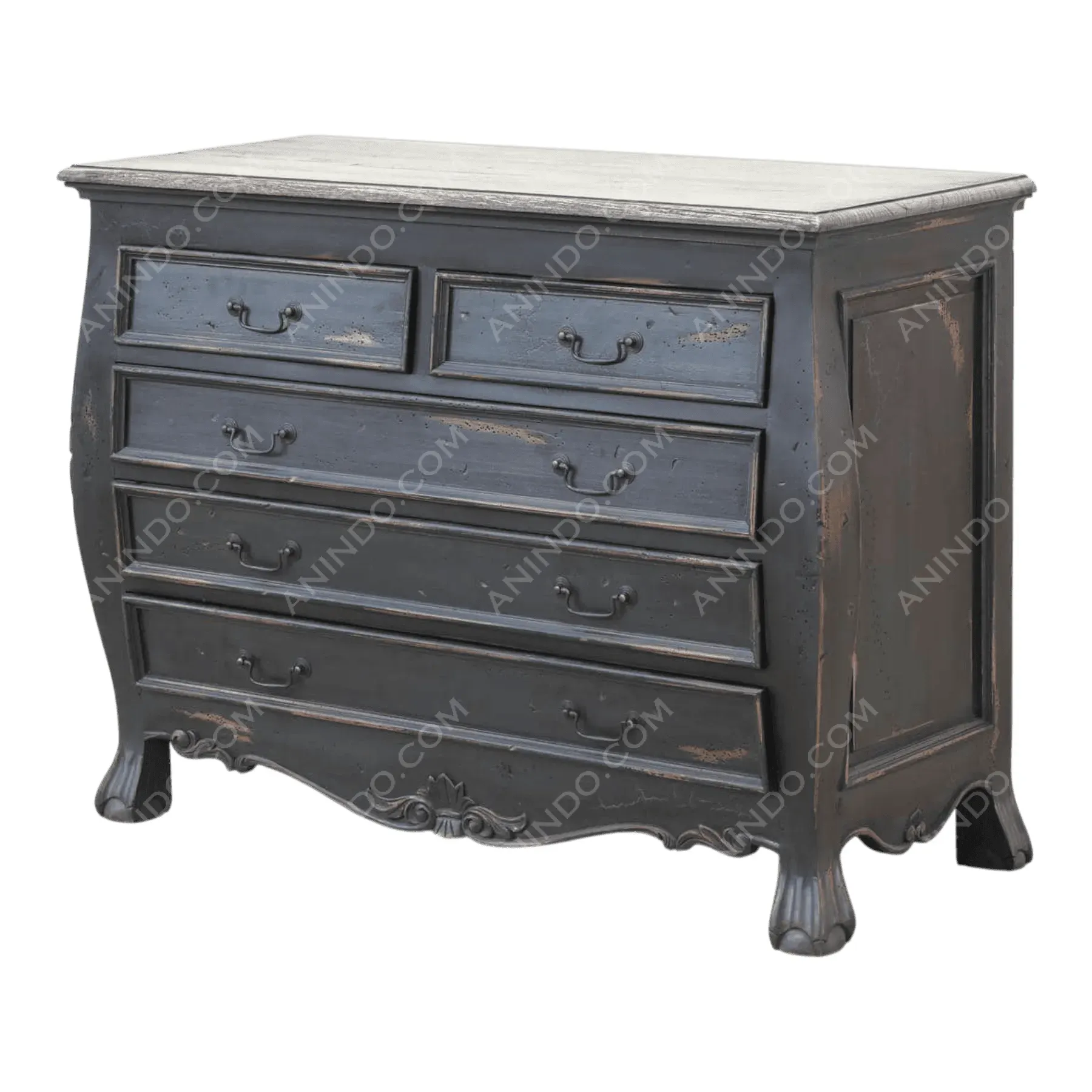 A classic bombé (curved) chest of drawers reimagined with a dramatically distressed finish. This four-drawer commode is defined by its fluid, outward-curving sides and apron, resting on subtle cabriole feet. The deep, dark black paint is artistically crackled and chipped, allowing the rich wood tone to peek through, accentuating the curves. The drawers feature traditional loop pulls. Topped with a clean, lighter surface, this piece introduces high-end European form with a moody, antique narrative, perfect for a sophisticated bedroom or hallway seeking historical grandeur with a modern edge.