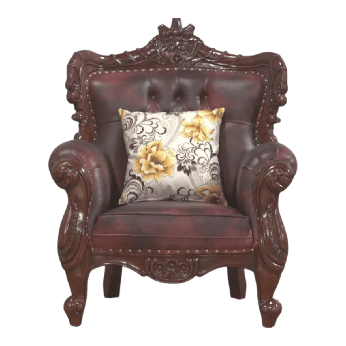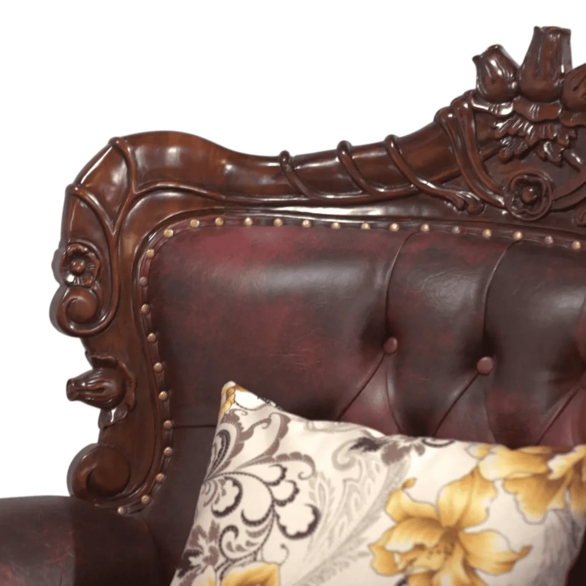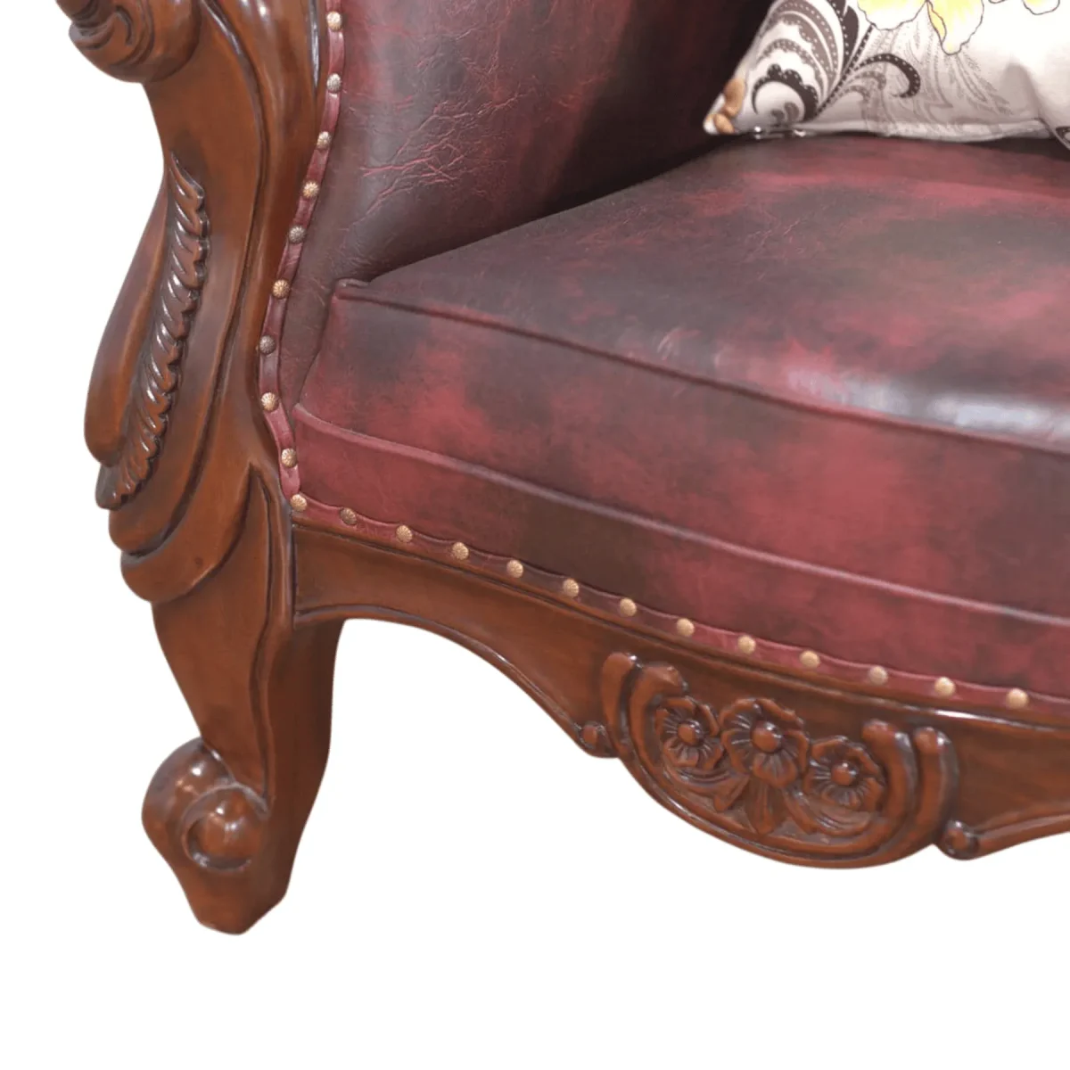 Sink into a world of unparalleled luxury with this commanding armchair that serves as the ultimate throne for your living space Wrapped in rich mahogany-toned leather that features a deep aged patina this piece invites you to experience comfort that has been centuries in the making The high backrest is meticulously tufted with deep buttons creating a texture that is as pleasing to the eye as it is to the touch Ornate hand-carved wood frames the silhouette with floral motifs that transition seamlessly into graceful cabriole legs Accompanied by a plush accent pillow featuring delicate botanical patterns this chair is designed to be the centerpiece of a curated reading nook or a grand fireplace setting where memories are forged and stories are told It is an investment in a lifestyle of relaxation and classical beauty