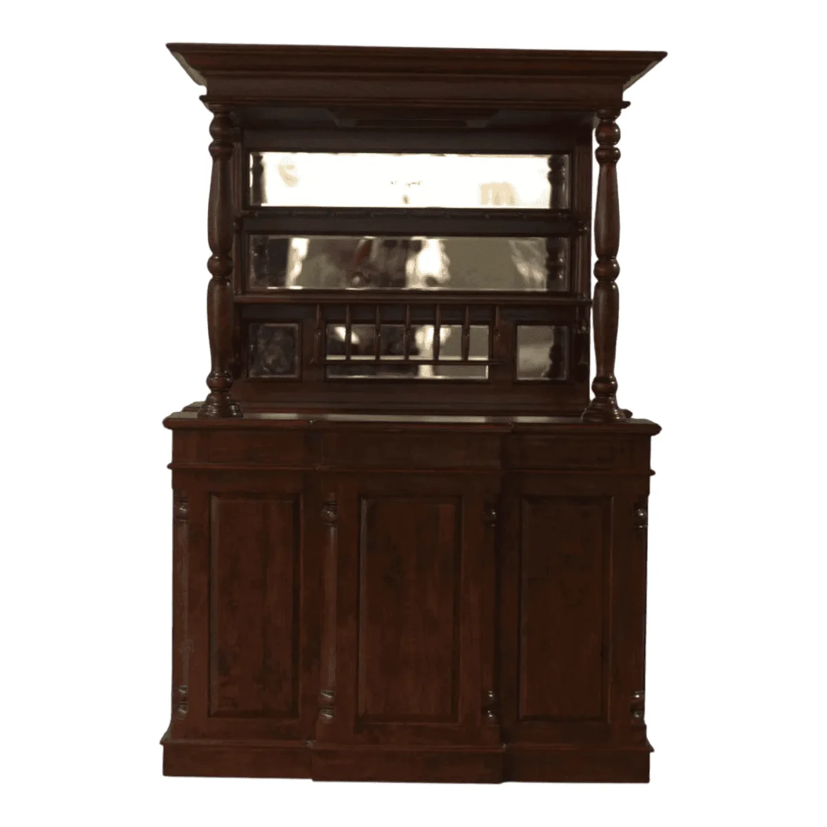 Transform your entertainment space into an exclusive private club with this imposing and expertly crafted home bar unit; finished in a deep warm timber tone this piece commands attention with its architectural canopy supported by elegant turned pillars The rear mirrored display adds depth and brilliance to your glassware collection while the integrated racks provide a professional-grade setup for the discerning mixologist Every inch of this unit speaks to a lifestyle of leisure and refinement from the smooth service counter to the discreet storage compartments hidden within the lower cabinetry The rich natural grain of the wood is celebrated through a lustrous finish that highlights the organic beauty of the material making it an ideal companion for aged leather armchairs and ambient lighting setups This bar is designed to be the heart of social interaction in your home
