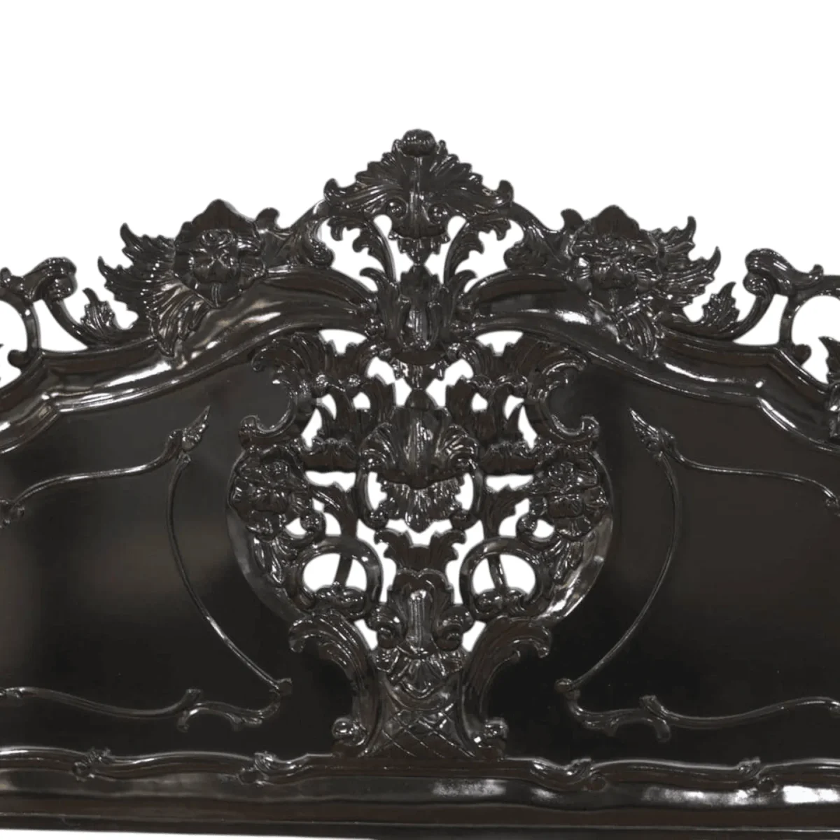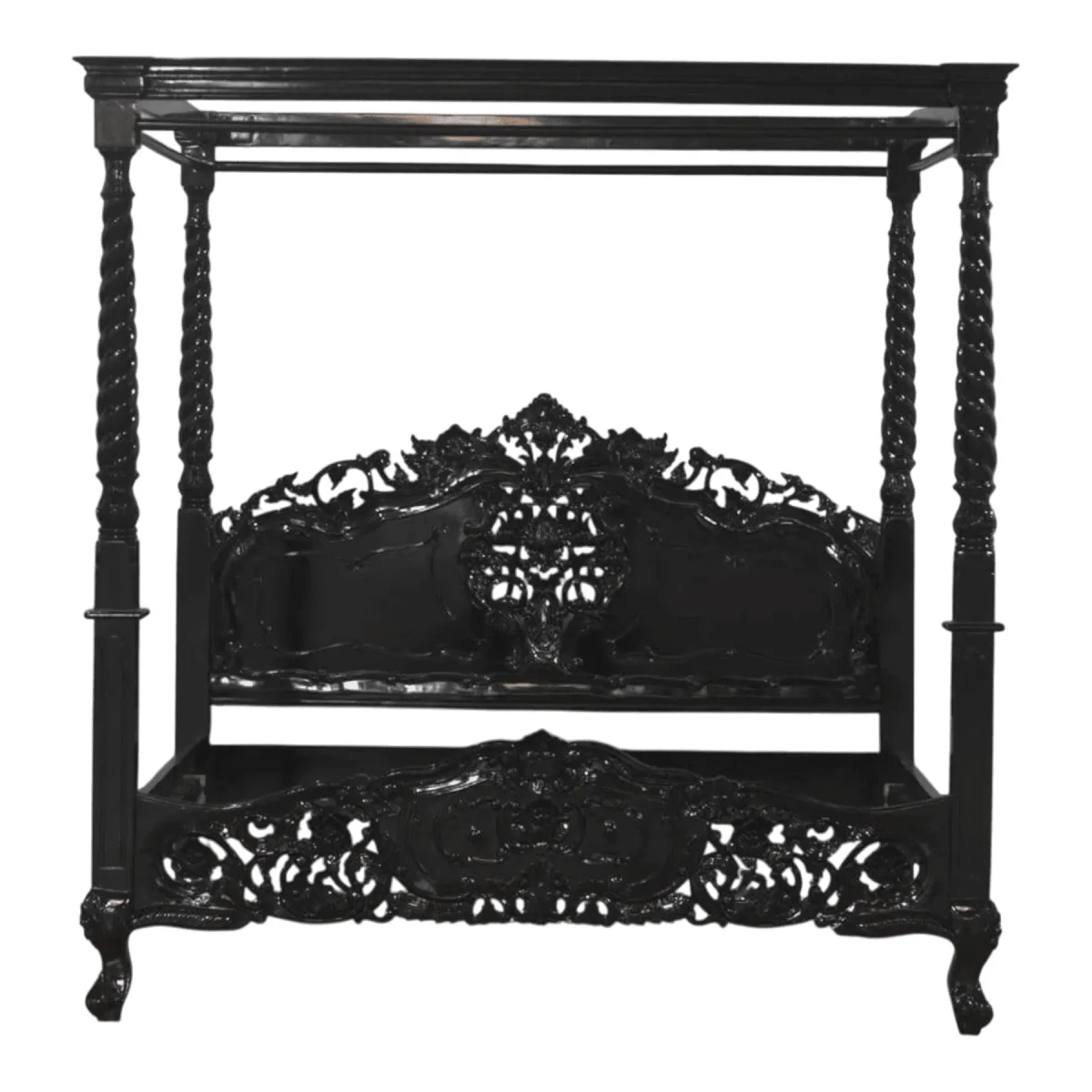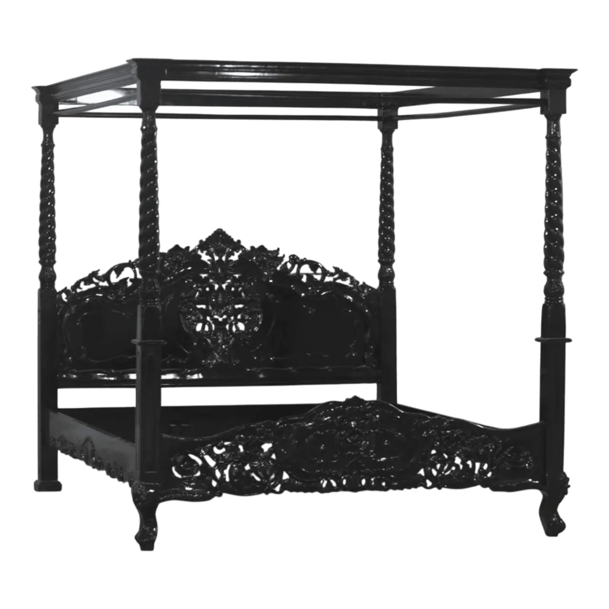 Command the room with an architectural masterpiece that brings the mystery of the grand estates into your home This four-poster bed is a triumph of monochromatic design featuring spiral-carved pillars that reach toward the ceiling to create a room within a room The headboard is a canvas of intricate openwork carving displaying floral and vine motifs that seem to grow organically from the solid mahogany frame Finished entirely in a high-gloss black this bed offers a modern and edgy interpretation of traditional canopy styles The sheer scale of the piece provides a sense of security and grandeur making it the ultimate destination for rest Each component is hand-finished to ensure a smooth and consistent luster that reflects your bold aesthetic choices Build your dream bedroom around this iconic piece that combines structural integrity with hauntingly beautiful artistry