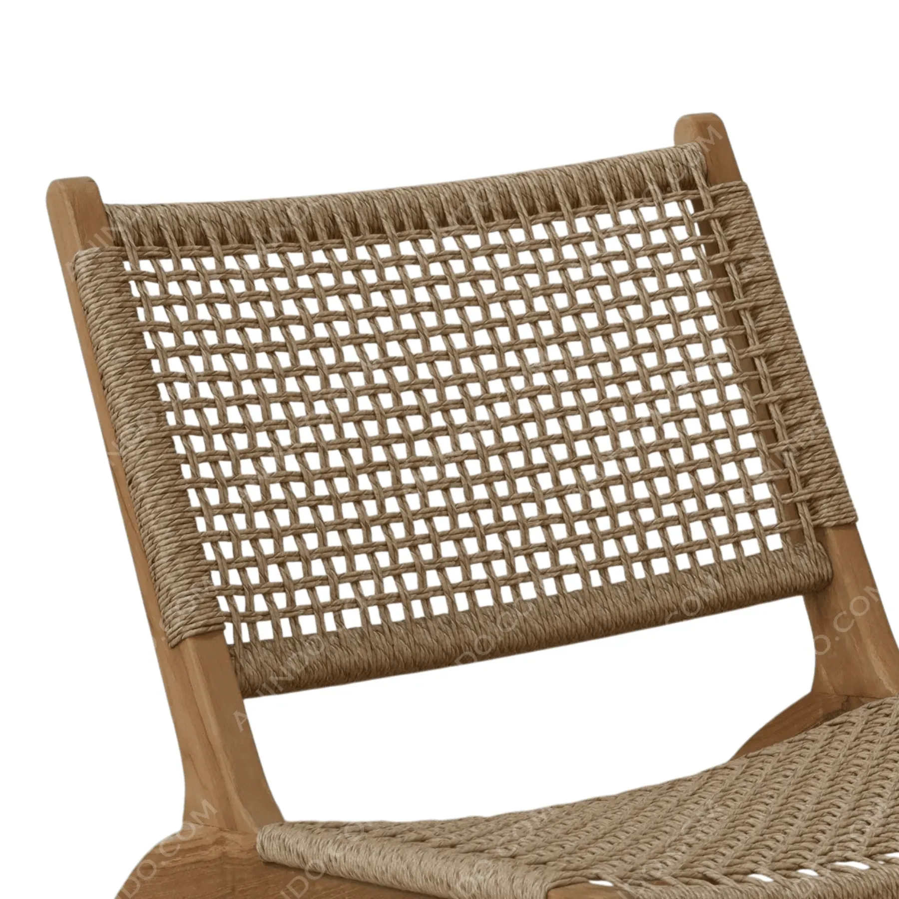 Primary Frame: Solid Teak wood | Seat/Back: Woven paper cord or synthetic rope (natural/beige) | Finish: Natural oil or light satin varnish