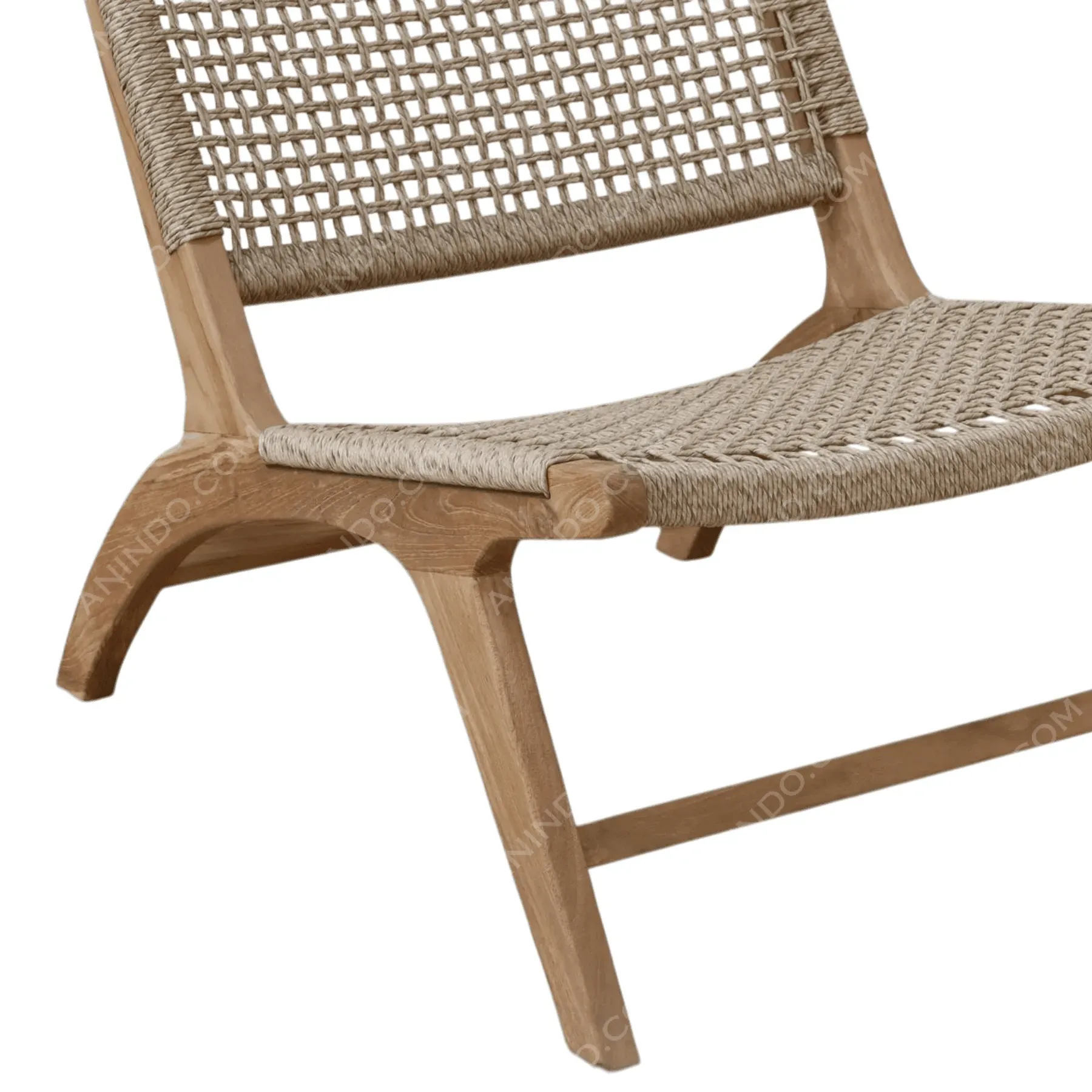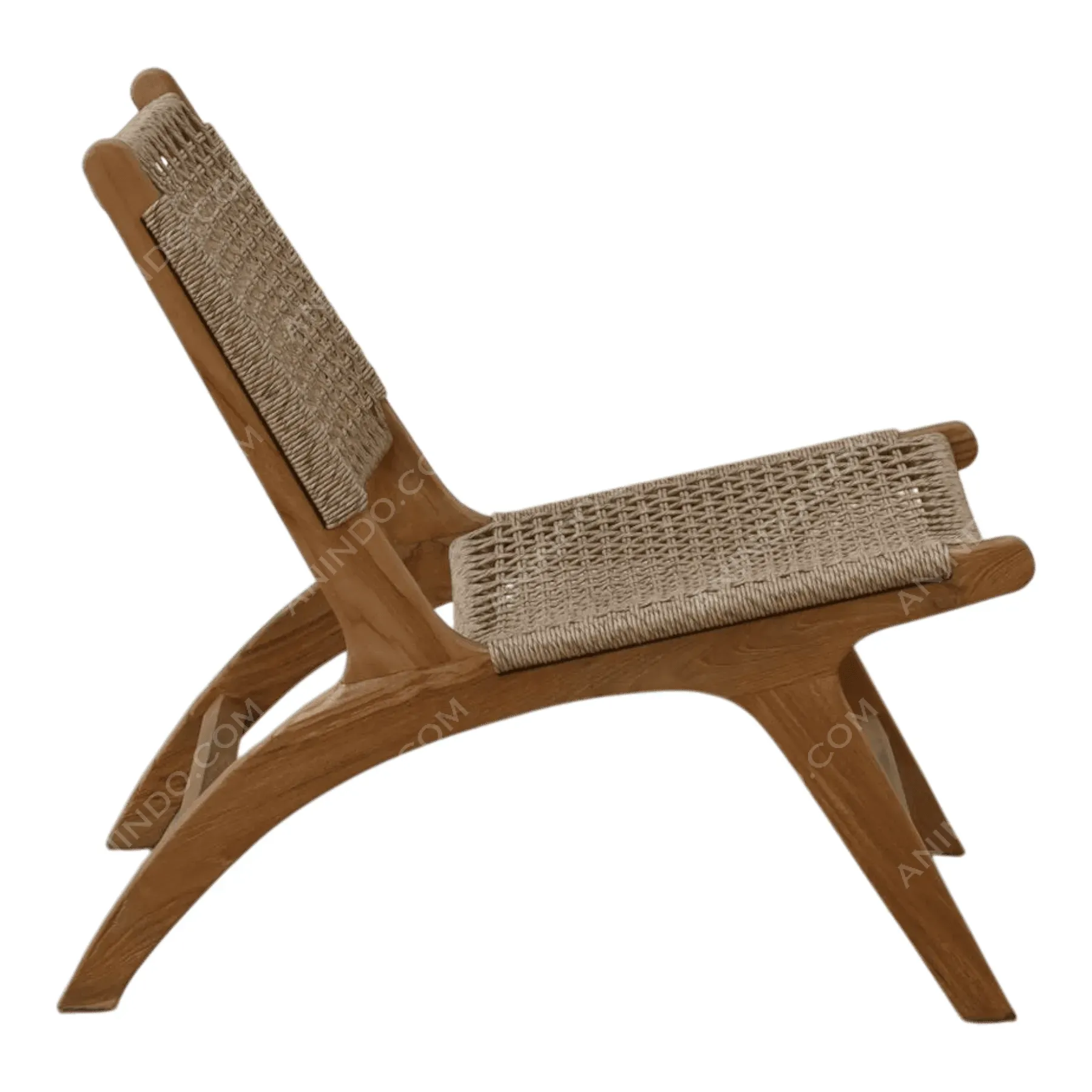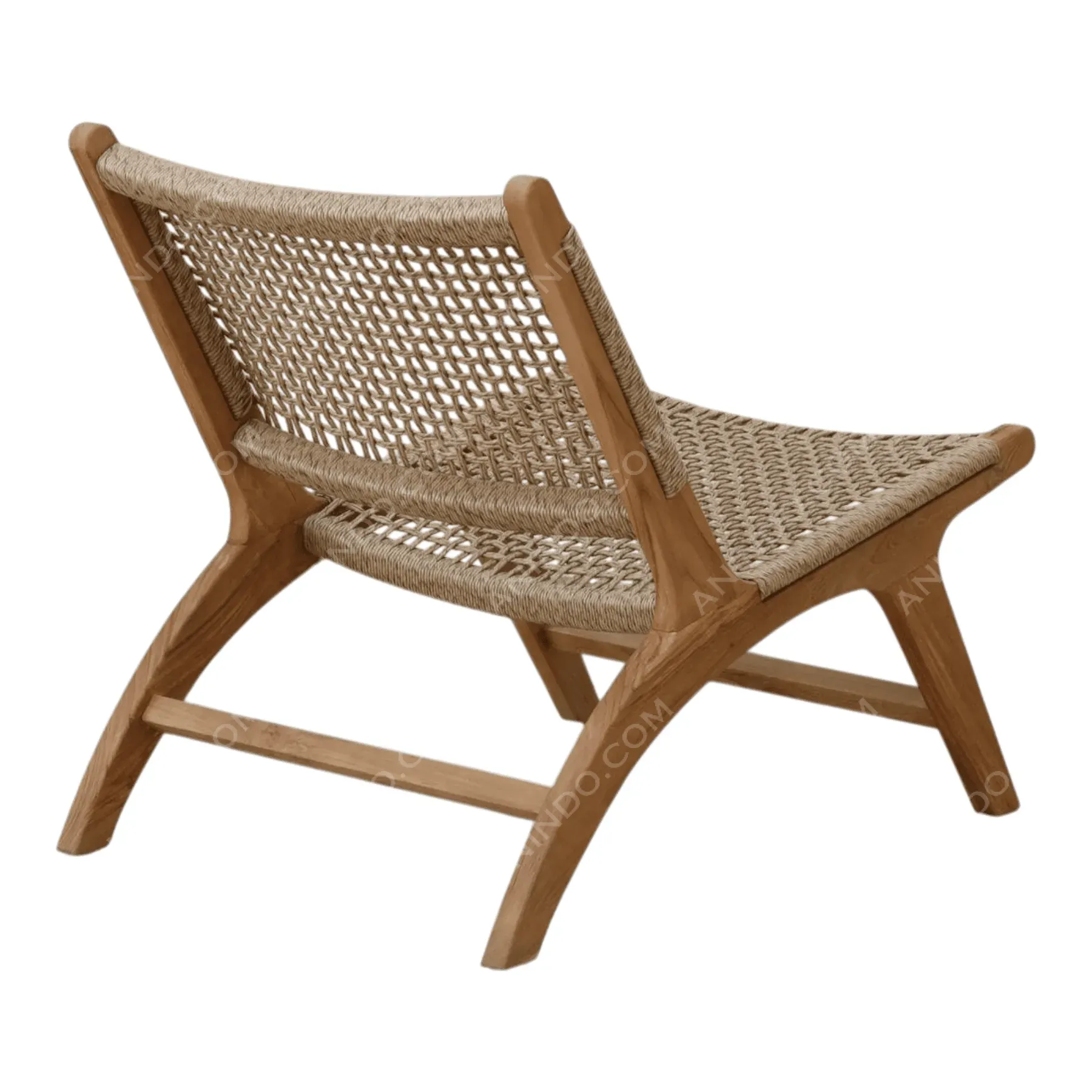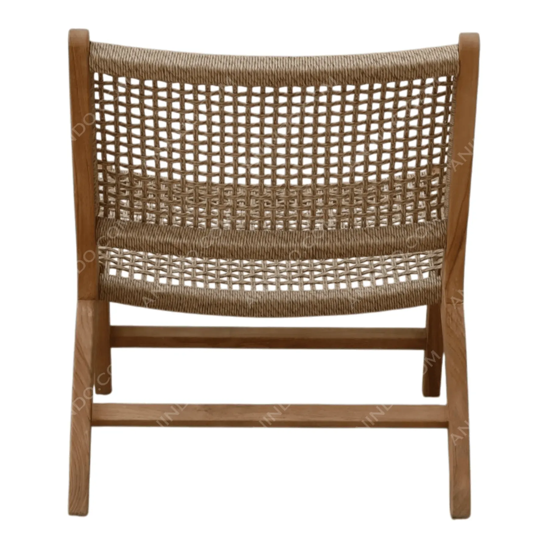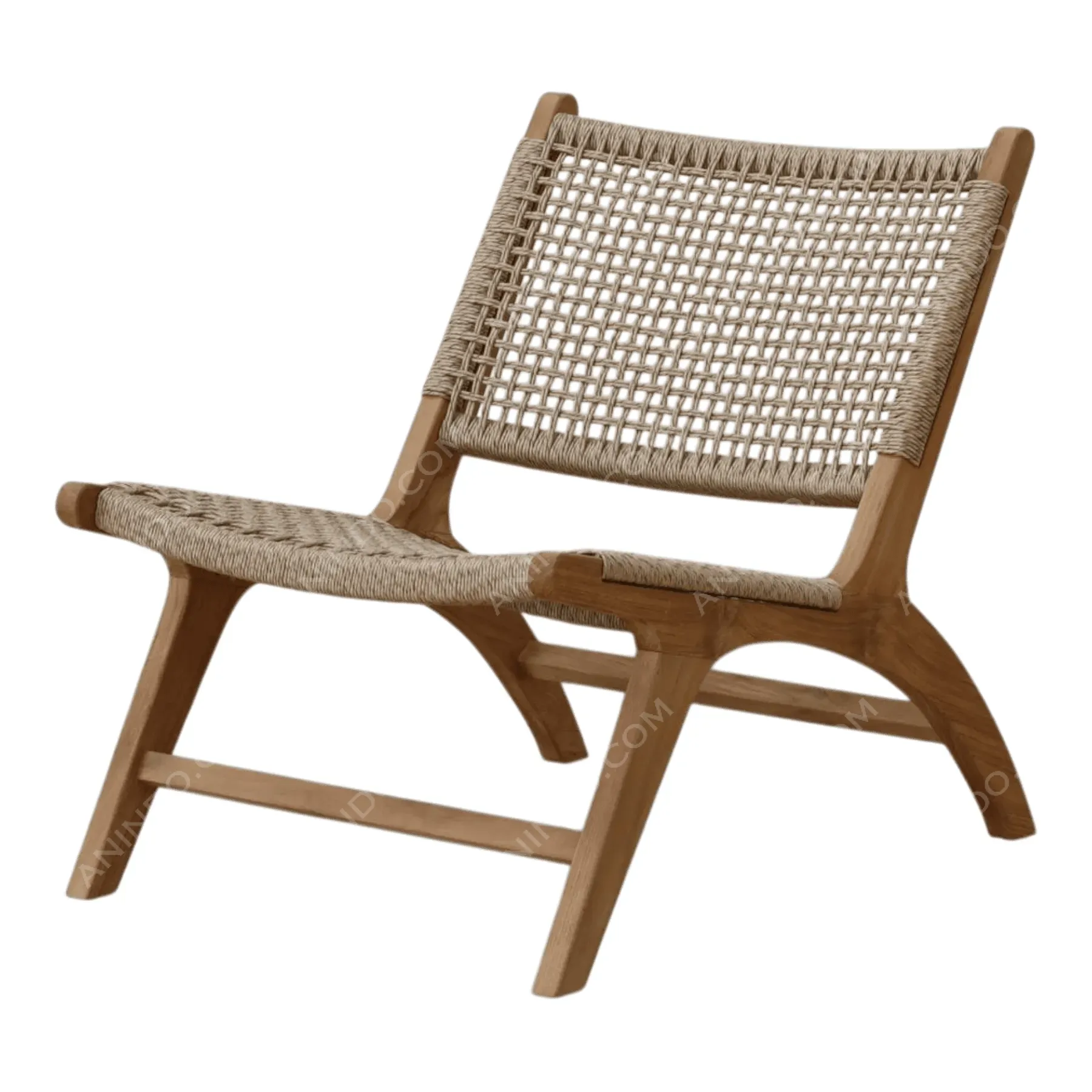 Inspired by classic Scandinavian and campaign furniture, this armless lounge chair is a study in lightweight elegance A solid, light-toned Teak wood frame features a low-slung, reclined profile The seat and back are hand-woven from a durable, natural-colored cord in an open, airy grid pattern This piece is a minimalist statement, offering surprising comfort and timeless, organic style for any modern living space