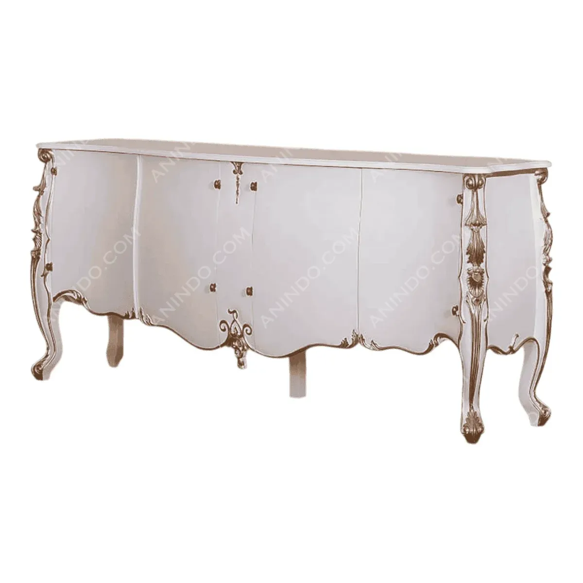 Inspired by the ornate aesthetics of the French Rococo period this sideboard emphasizes graceful lines and intricate ornamentation to create a sense of romantic luxury It celebrates traditional craftsmanship through its dramatic silhouette and decorative woodwork making it an ideal choice for classic or eclectic interior design styles