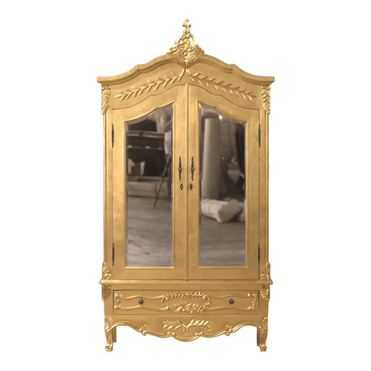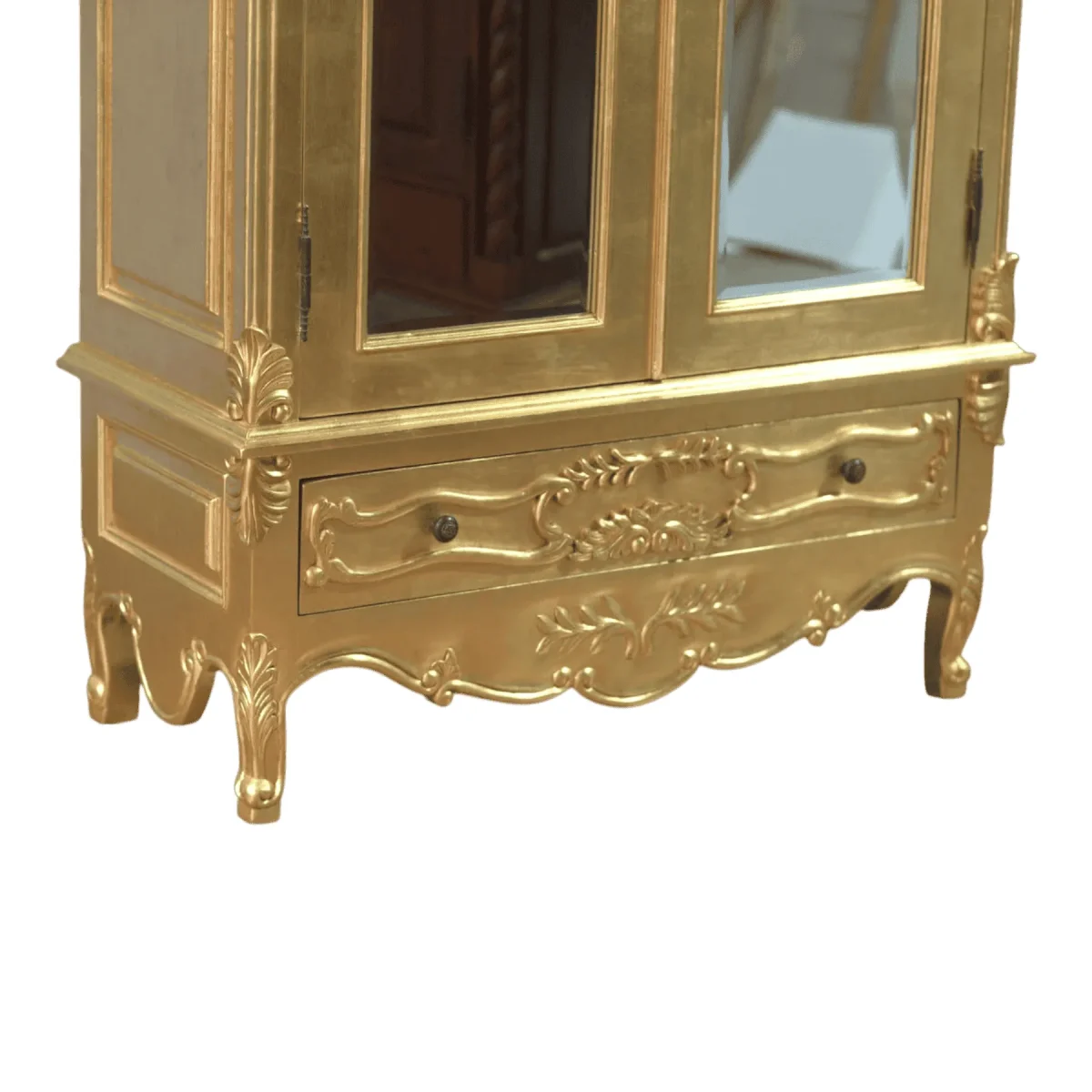 Showcase your most prized possessions or your finest wardrobe within this luminous display cabinet that radiates light through its full-length glass panels and brilliant gold finish This armoire is a masterclass in ornamental design featuring botanical carvings and a shapely crown that draws the eye upward to appreciate its full height The lower drawer provides discreet storage for delicate items while the main compartment offers a clear view into a world of curated elegance Supported by elegant cabriole legs the piece feels light despite its significant stature making it a versatile addition to a formal dressing room or a grand living area Its reflective surfaces dance with ambient light ensuring that the wardrobe itself becomes a source of brightness and joy within the home This is functional art designed to preserve and celebrate the things you value most in a shell of pure gold