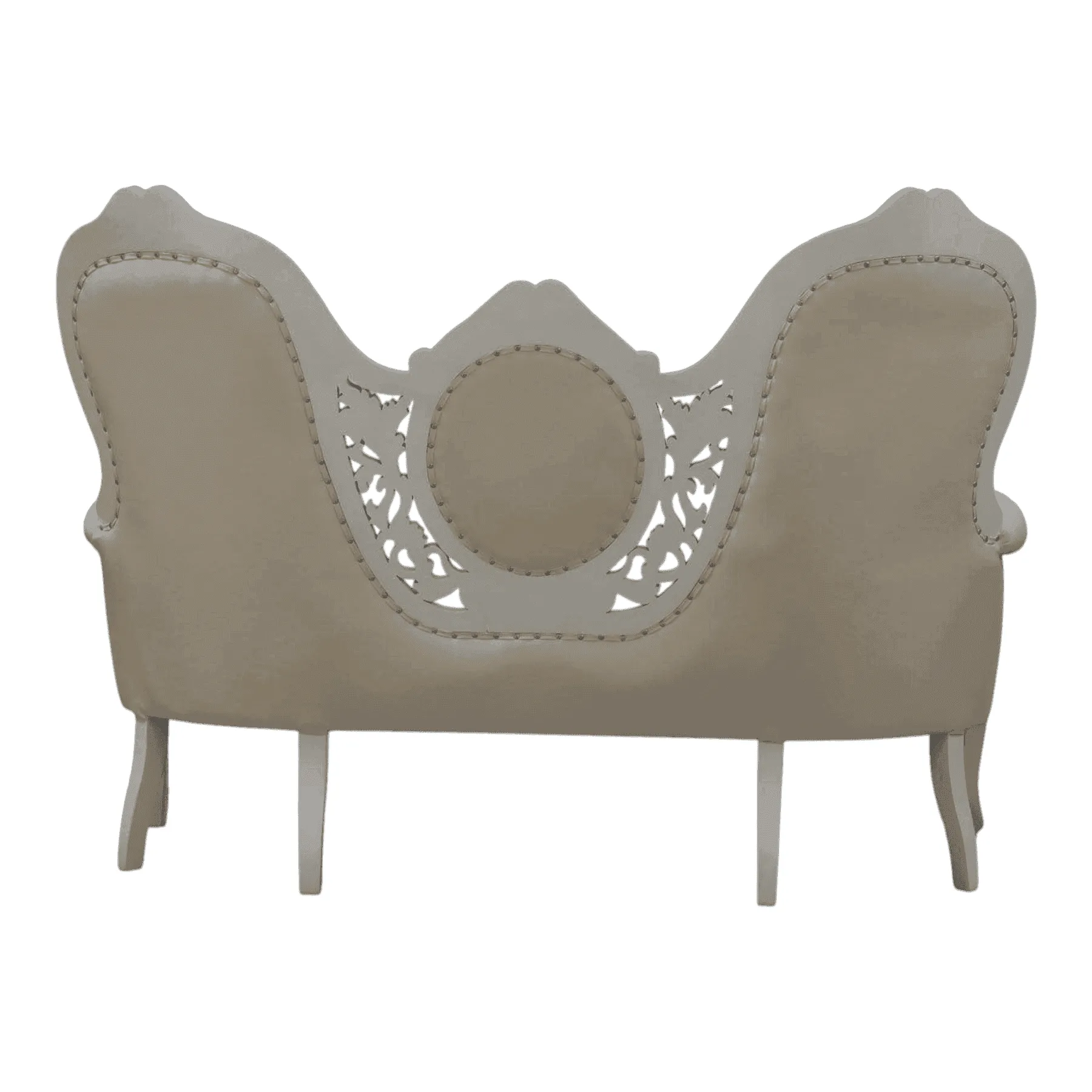 Primary Frame: Hand-Carved Mahogany | Joinery: Carved-Through Frame | Finish: Antique White Lacquer | Upholster & Cushion: Off-White Velvet or Linen-Blend with Button Tufting