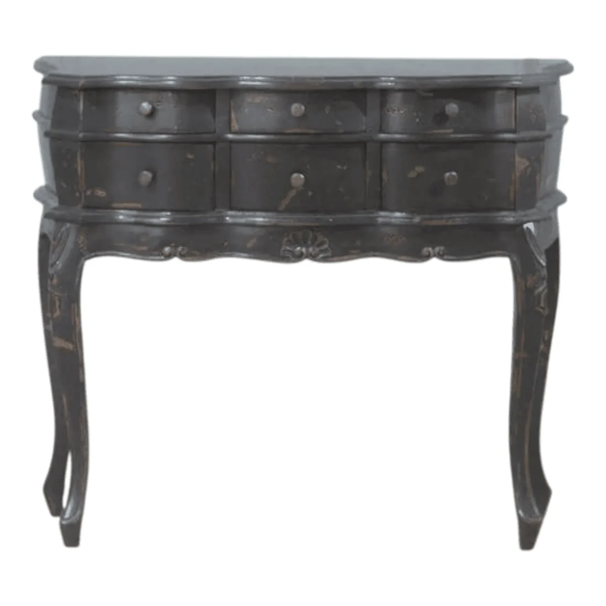 Elevate your home’s storage capabilities with this sophisticated six-drawer console that exudes a sense of mysterious elegance and old-world craftsmanship The deep charcoal finish is expertly distressed to show subtle signs of age giving the piece an authentic vintage soul that fits perfectly in a library or a moody dining room Its undulating front panels create a beautiful play of light and shadow while the slender cabriole legs provide a graceful lift that keeps the heavy storage capacity from feeling bulky Each of the drawers is perfectly sized for organizing silverware linens or office supplies making it a highly functional addition to your daily life This console table represents the perfect marriage of form and function designed for the homeowner who values the dark and dramatic side of traditional luxury furniture