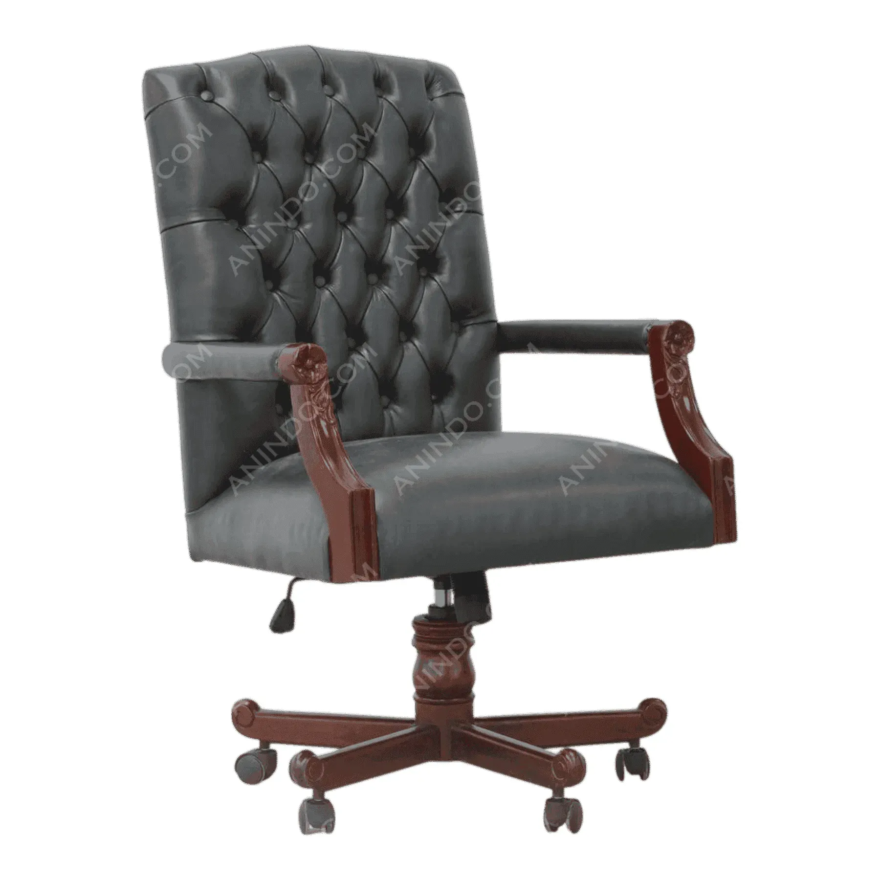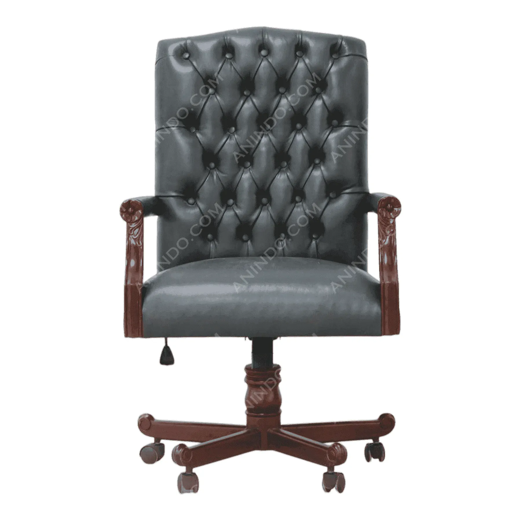Primary Frame: Solid Hand-carved Mahogany Wood | Upholstery: Button-tufted Genuine Leather | Base: Solid carved wood with swivel mechanism