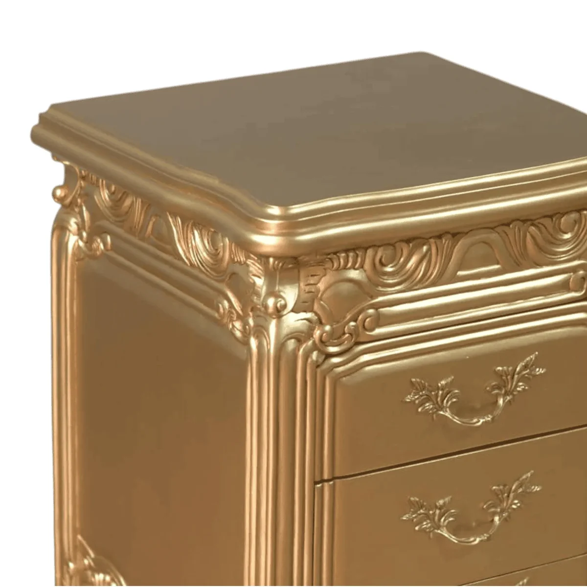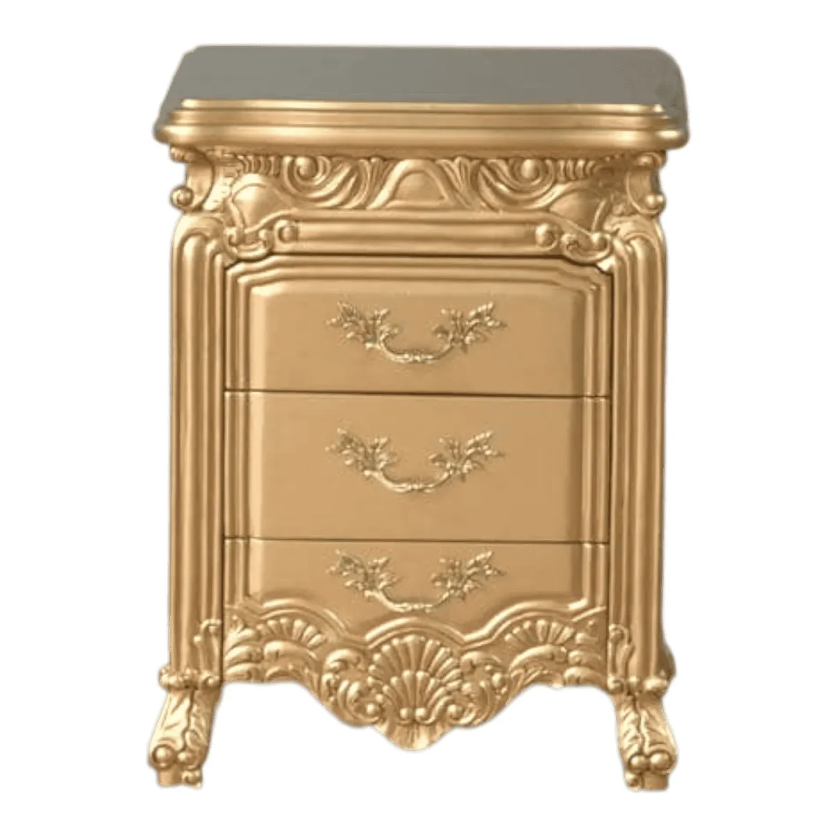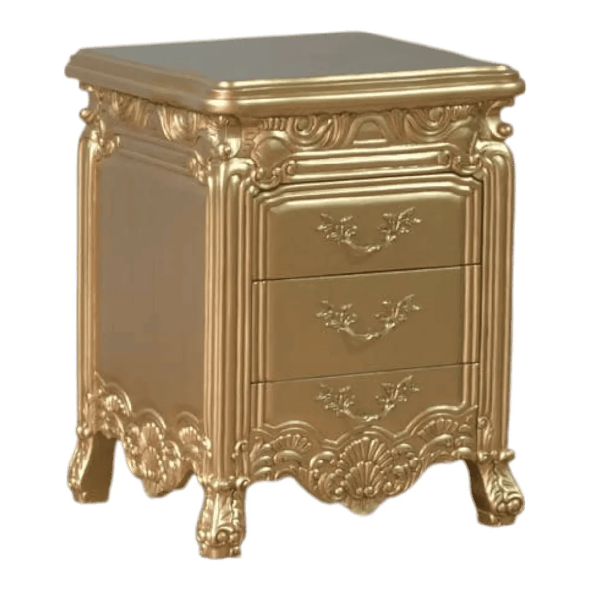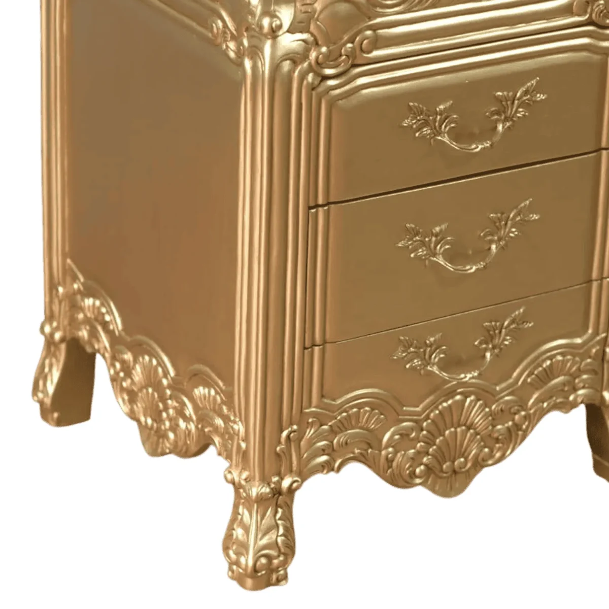 Transform your sleeping quarters into a sanctuary of opulence with this three-drawer nightstand finished entirely in a breathtaking gold leaf coating The piece features dense ornate carvings including shell and scroll motifs that wrap around the base and edges creating a thick textured appearance The drawers are equipped with vintage-style brass pulls that complement the overall golden hue while offering practical storage for bedside essentials This nightstand is not just a piece of furniture but a statement of prosperity and refined taste designed to pair perfectly with a grand upholstered bed and silk linens