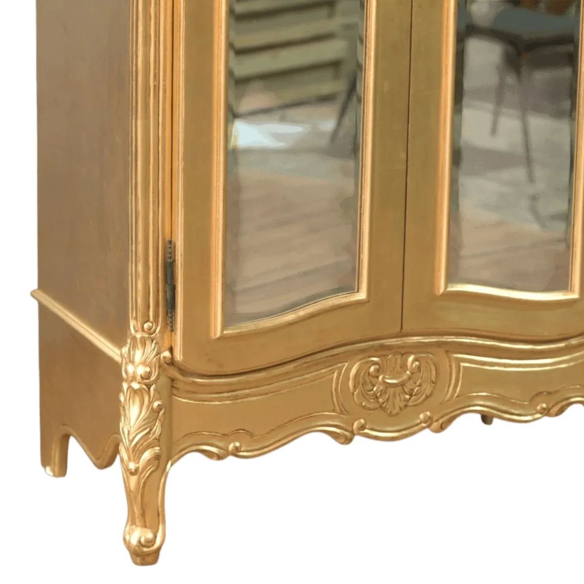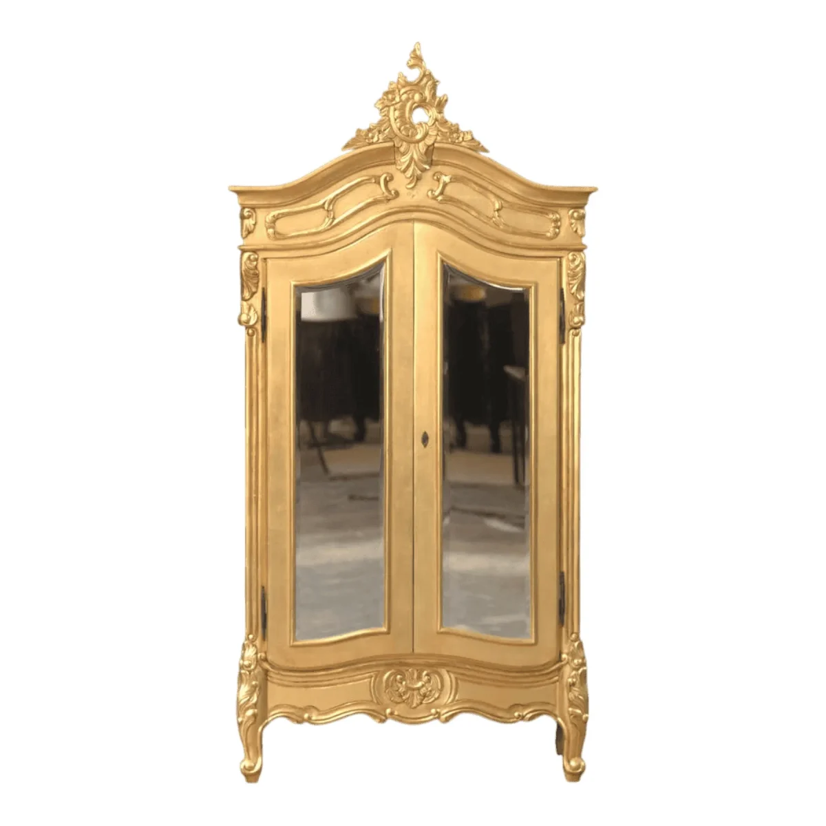 Radiate sophistication with a wardrobe that shines with the brilliance of a thousand sunsets finished in a stunning gold leaf effect this armoire brings a royal presence to your interior storage the mirrored doors not only provide a functional full-length view but also work to expand the perceived space of your room by reflecting light into every corner intricate scrollwork along the base and the majestic pediment at the top showcase a level of detail usually reserved for historical palaces this piece is designed for the collector of fine things who views storage as an opportunity for artistic expression inside the generous shelving provides ample space for organized luxury while the exterior serves as a luminous focal point that transforms a simple bedroom into a sanctuary of light and gold