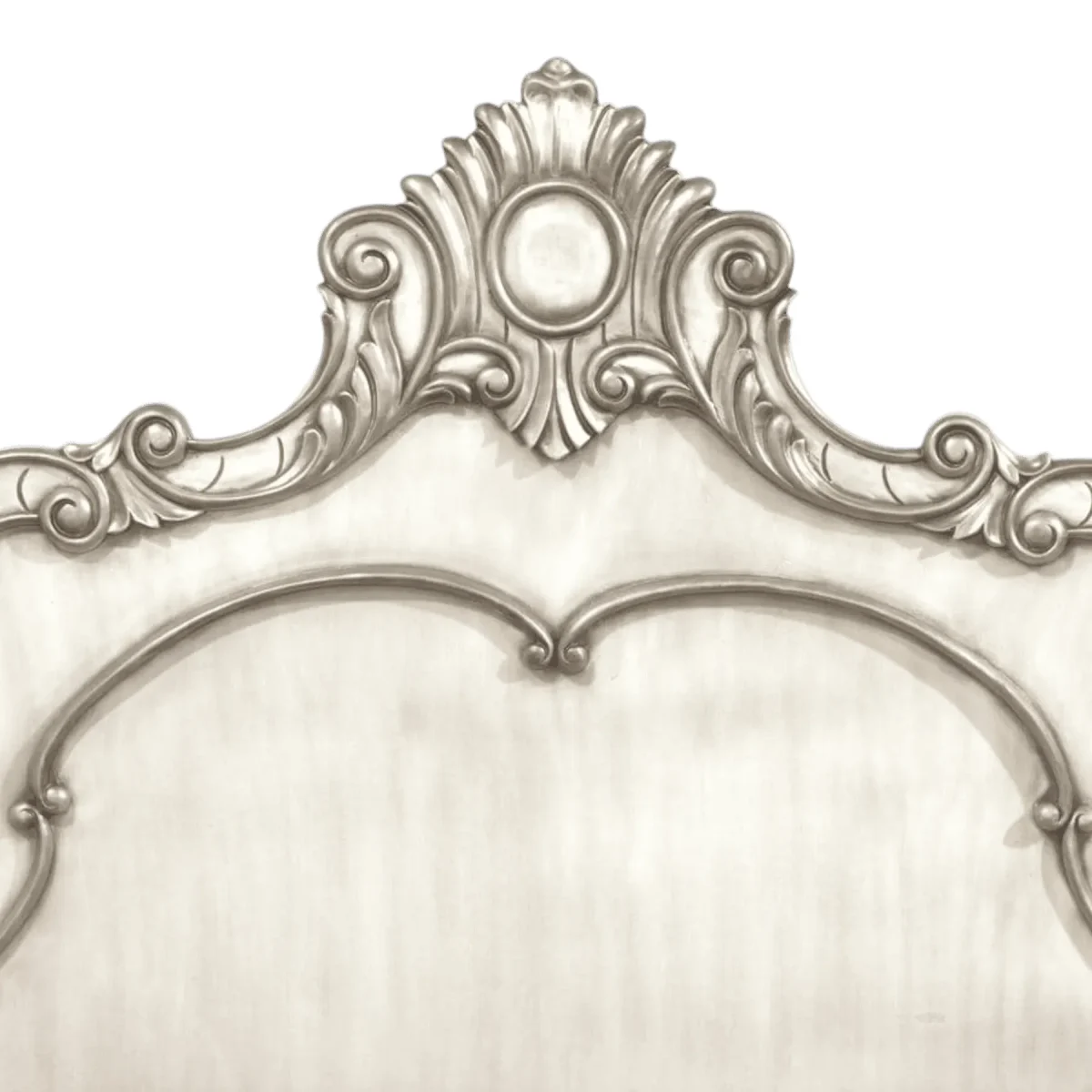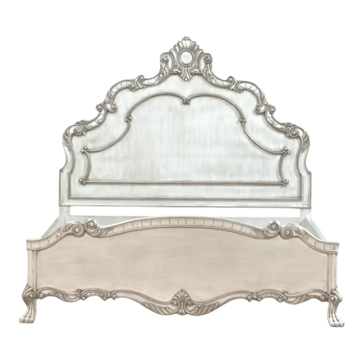 Primary Frame: Grade A Mahogany | Joinery: Mortise and Tenon with Hand-Carved Appliques | Finish: Distressed Antique White with Silver Leaf Accents | Upholster & Cushion: Smooth Lacquered Wood Panels