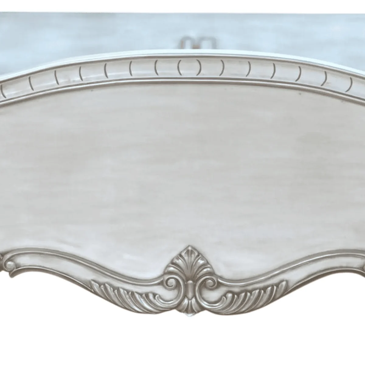 Base Wood: Antique White with cool grey undertones and silver leaf highlights Surface Finish: Distressed matte lacquer with metallic detailing